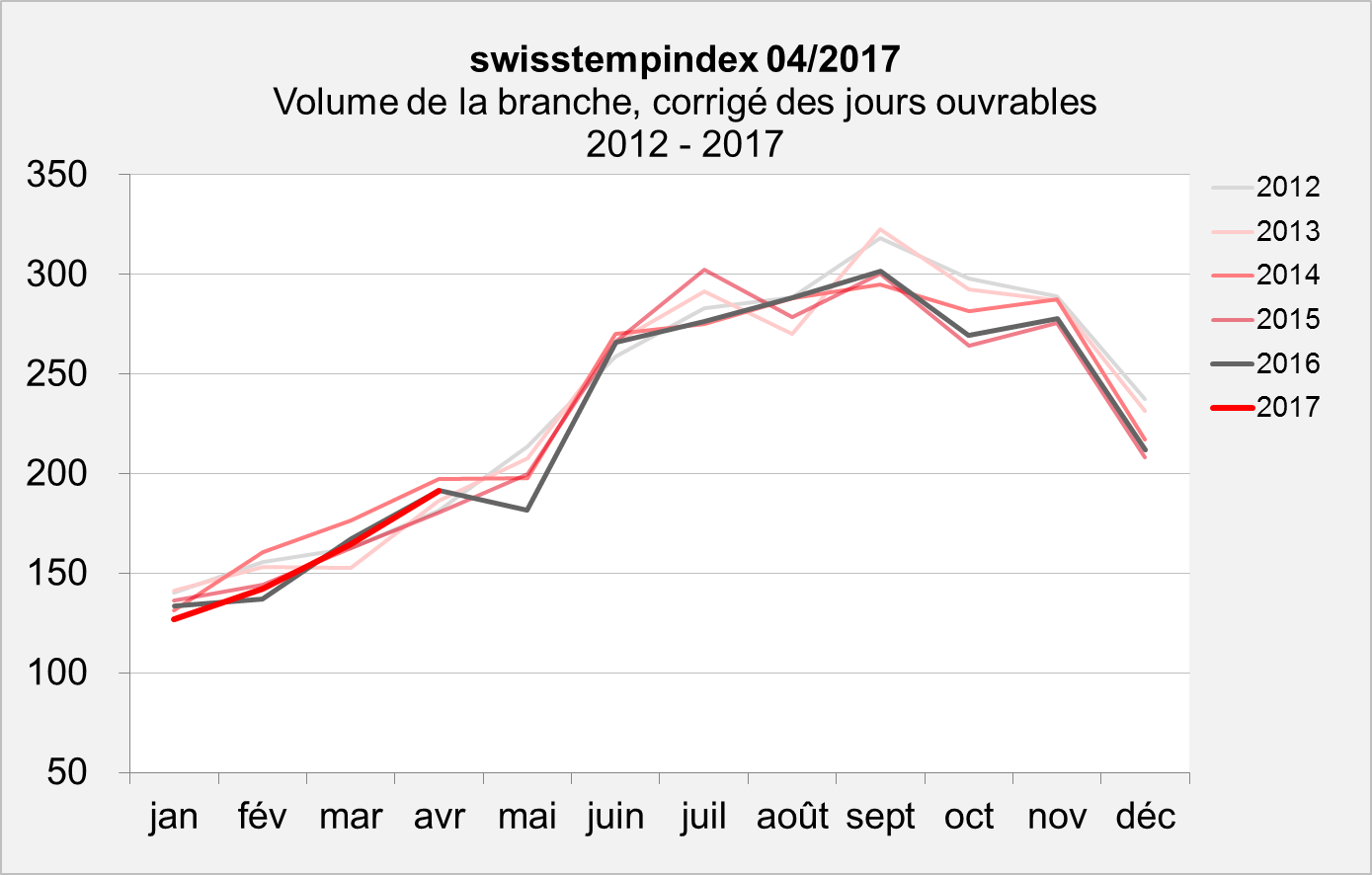 Pour la branche du travail temporaire, avril 2017 a été positif. Après correction des jours fériés, le swisstemptrend a augmenté de 1,8% par rapport à l'année dernière. Si l'on ne corrige pas les jours fériés, le développement est négatif depuis le début de l'année en raison des journées fériées de Pâques. Les heures de mission ont diminué de 2%. Toutefois, une analyse des douze derniers mois montre que la diminution a été plus modeste (1,1%). Nous devrions bientôt sortir des chiffres rouges, si l'atmosphère positive du mois d'avril se poursuit en mai.