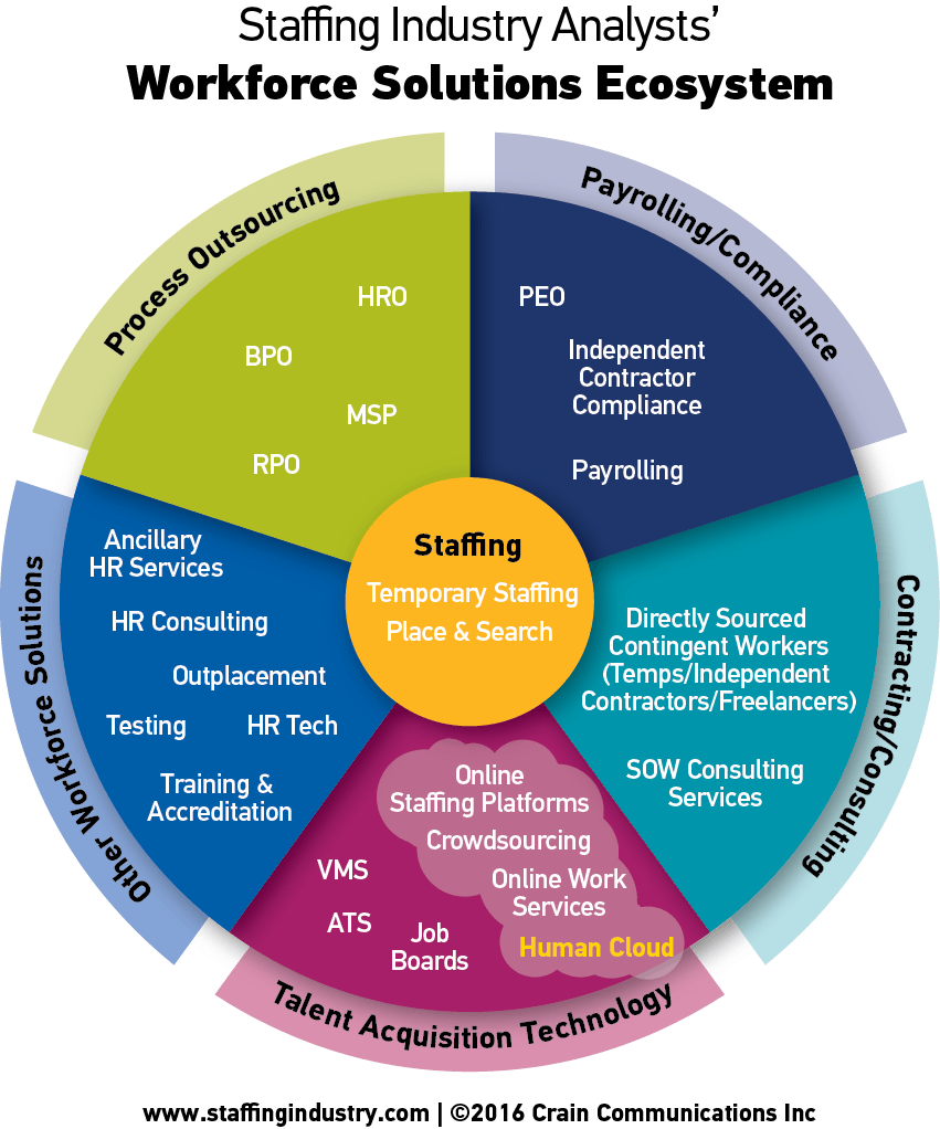 - Talent acquisition technology: une méthode de recrutement basée sur les nouvelles technologies, du branding de l'employeur à l'embauche finale, en passant par la création d'un pool de talents et le recrutement. Concrètement, cette prestation se traduit par des plateformes d'emploi, des systèmes de gestion des candidatures, le contrôle des fournisseurs pour gérer le personnel externe, sans oublier les nouvelles plateformes dédiées dans le cloud.