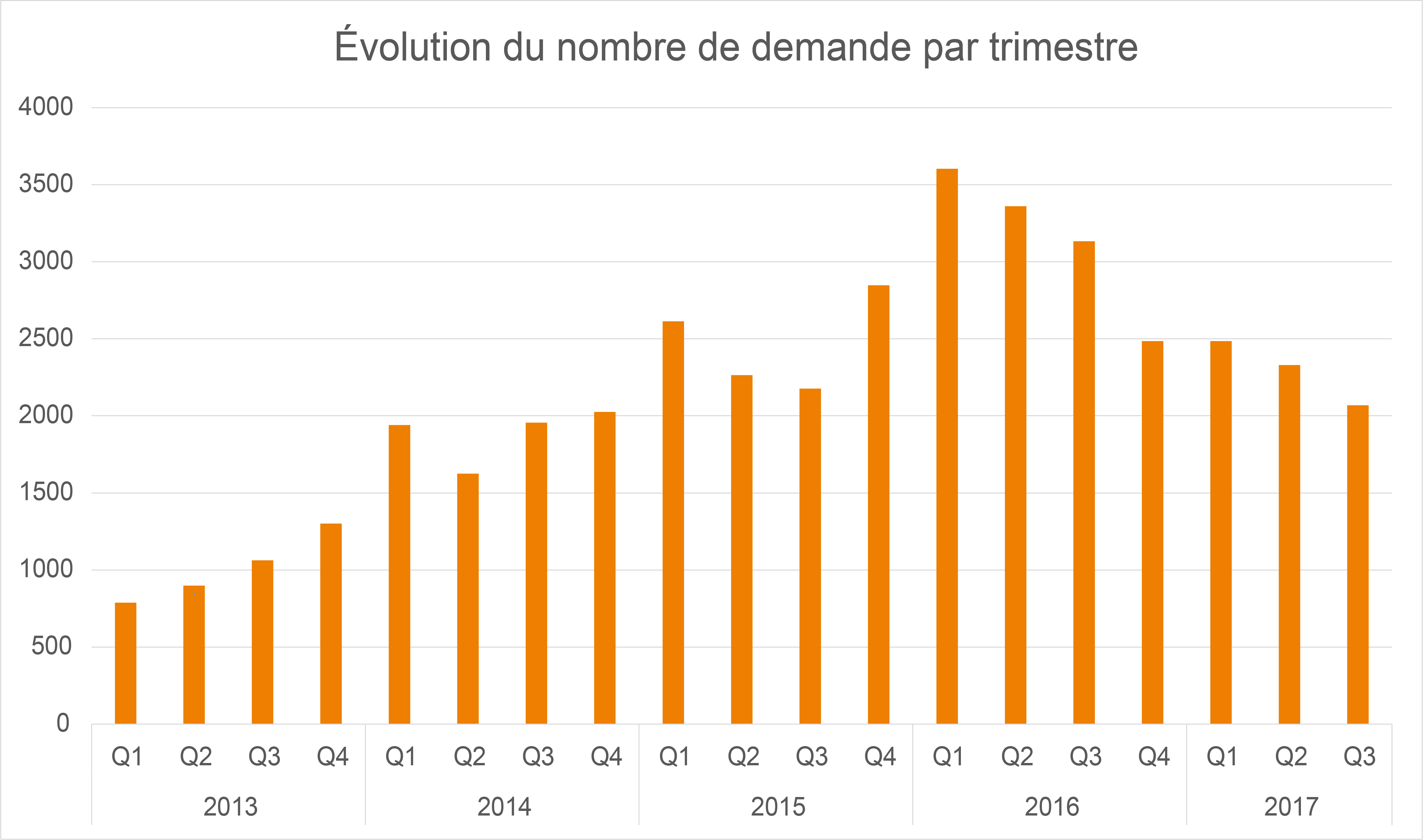 À la mi-2016, le fonds pour la formation continue de temptraining se trouvait dans une situation pour le moins délicate. Depuis que ce fonds a été lancé, le nombre de demandes est passé de 800 au premier trimestre 2013 à plus de 3500 au troisième trimestre 2017. Cela représente une croissance de plus de 400% (voir graphique no 1). Le nombre accru des demandes a suscité une hausse des obligations financières, et cette tendance n'était pas près de s'inverser. Des mesures d'économie radicales étaient donc nécessaires pour préserver la solvabilité de temptraining.
