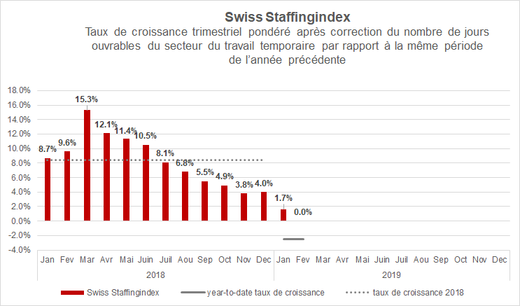Depuis le début de l'année, le nombre des heures de travail effectuées corrigées du nombre des jours ouvrables a diminué de 2,5%. Grâce aux bonnes valeurs de décembre, le Swiss Staffingindex, qui compare les trois derniers mois avec la même période de l'année précédente, enregistre donc un «zéro rouge». Sans une évolution surprenante des affaires en mars, la croissance au premier trimestre devrait être négative.