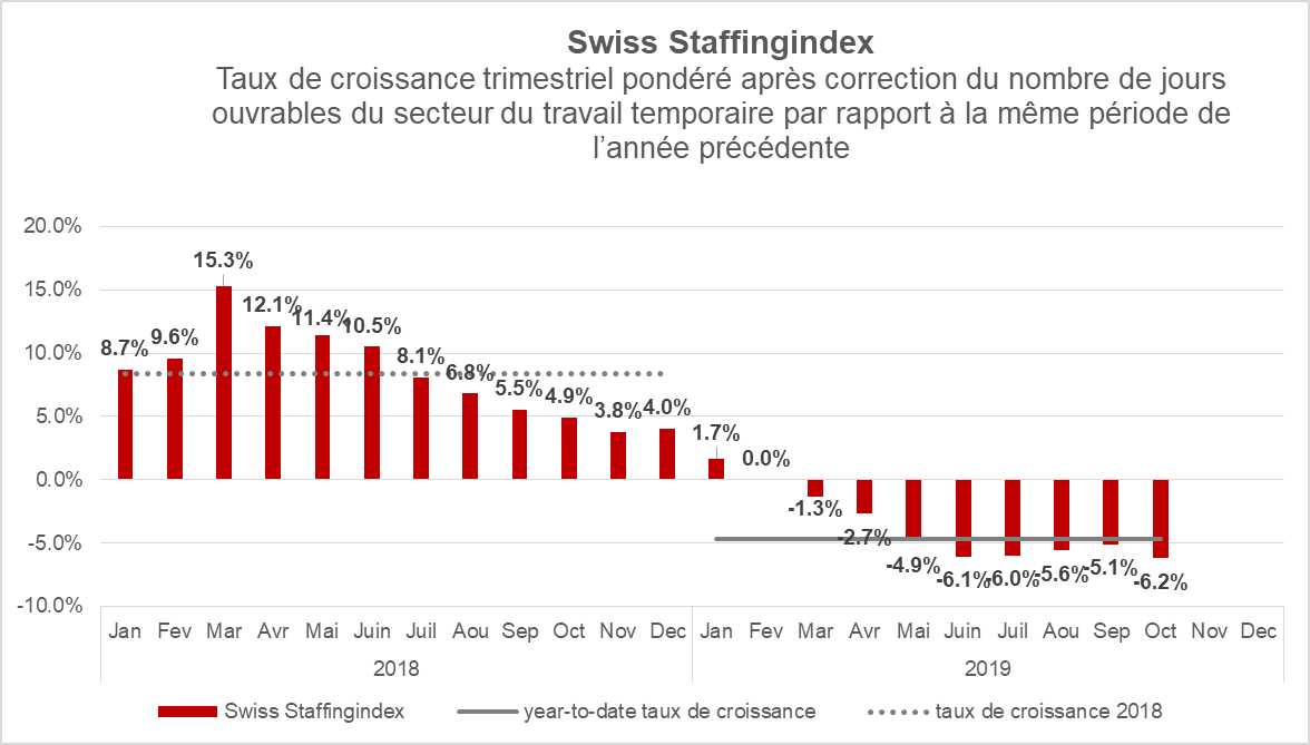 Le Swiss Staffingindex nous annonce qu'au cours des trois derniers mois, le nombre d'heures de travail effectuées a diminué de 6,2% par rapport à la même période de l'année dernière. En comparaison avec les chiffres de l'année précédente, on constate un recul de 4,7% depuis le début de l'année. Dans la branche du travail temporaire, le marché reste donc difficile. Cependant, aucune dégradation plus importante ne se profile à l'horizon. Les chiffres rouges que connaît actuellement la branche du travail temporaire sont une conséquence directe d'une conjoncture faible au niveau mondial.