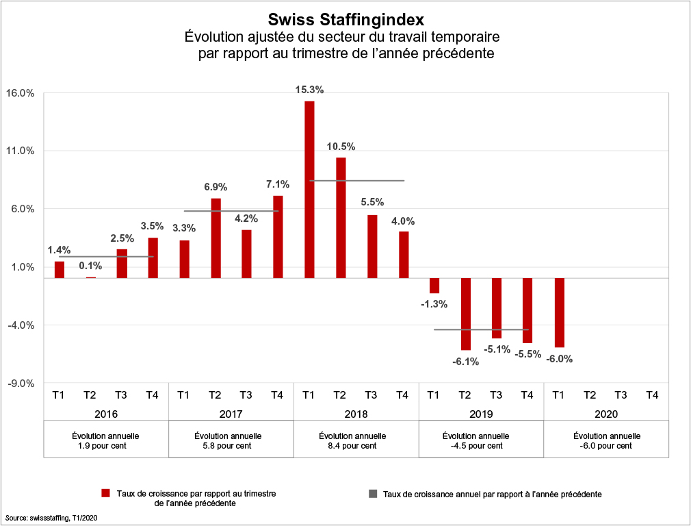 Selon le Swiss Staffingindex, la crise du coronavirus a entraîné un recul de 12% des heures de mission effectuées par les travailleurs temporaires en mars par rapport à l'année précédente – sans tenir compte des heures de chômage partiel. Une enquête de gfs-zürich montre que, en moyenne, presque un travailleur temporaire sur deux s'est retrouvé au chômage partiel après le confinement quand une entreprise de travail temporaire en a fait la demande. Cela a été le cas pour 60% des prestataires de services de l'emploi. Compte tenu de la faible baisse enregistrée en janvier et février, le recul de l'activité sur l'ensemble du premier trimestre 2020 se limite à 6%. Mais dans la mesure où le confinement n'est entré en vigueur qu'à la mi-mars, l'activité devrait plonger davantage au mois d'avril.