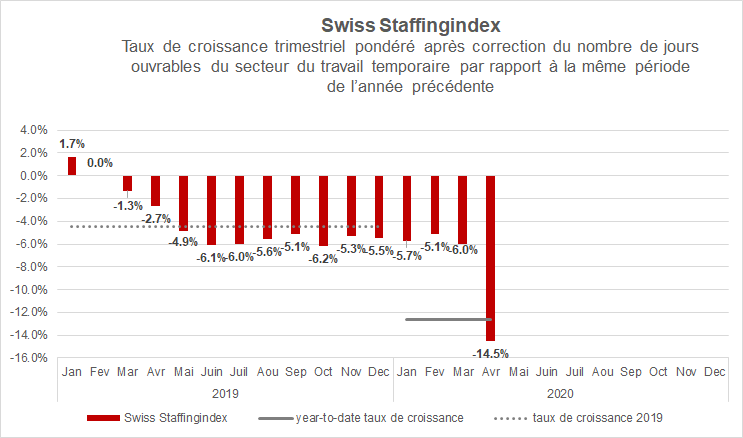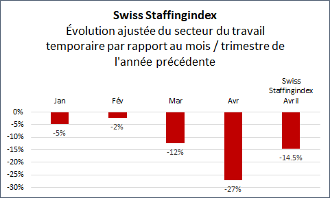 Le Swiss Staffingindex actuel indique que, de février à avril 2020, l'activité commerciale de la branche du travail temporaire a reculé de 14,5% par rapport à l'année précédente. En avril, premier mois d'exercice complet depuis le début du confinement, le nombre d'heures de travail effectuées a baissé de 27%. Ces chiffres n'incluent pas les heures de chômage partiel.