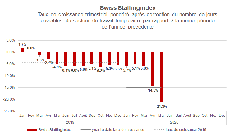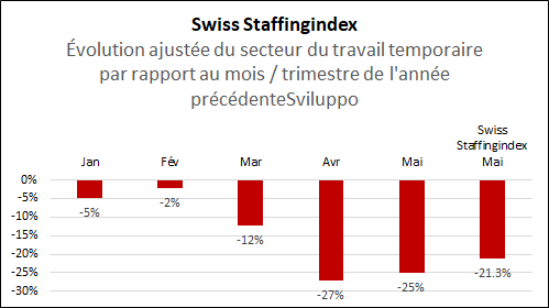 Le Swiss Staffingindex indique qu'en mars, en avril et en mai 2020, l'activité commerciale de la branche du travail temporaire a reculé de 21,3% par rapport à l'année précédente. Avril et mai, les deux mois d'exercice complets sous l'impact du coronavirus, ont enregistré une baisse respective de 27% et de 24%. Les mesures d'assouplissement introduites en mai n'ont pratiquement pas stimulé l'évolution économique.
