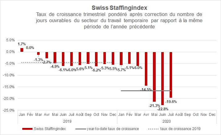 En juillet, le Swiss Staffingindex a baissé de 19,6% par rapport à la même période de l'année dernière. Alors qu'en mai et en juin, les heures de travail avaient diminué de plus de 20%, l'activité commerciale semble peu à peu se normaliser. Sans nouveaux confinements, cette tendance annonce peut-être une stabilisation. Depuis le début de l'année, la branche affiche un déficit de 16,7%.