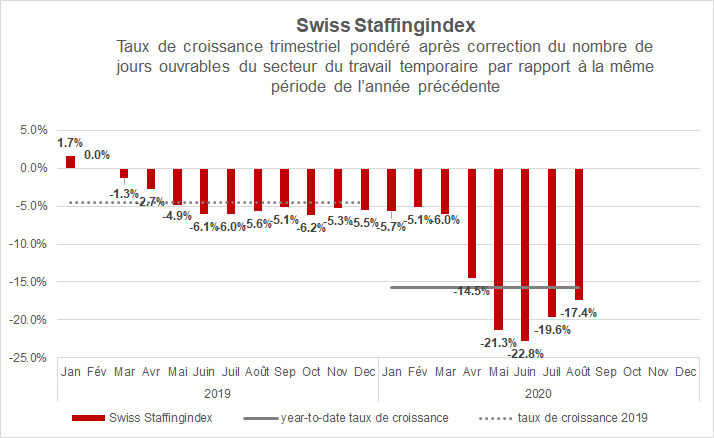 Selon le dernier Swiss Staffingindex, l'activité commerciale des trois mois écoulés a reculé de 17,4% par rapport à l'année passée. Cette chute, précipitée en avril par la crise du coronavirus, a franchi le creux de la vague en juin et, depuis, ralentit à vue d'œil: chaque mois, le repli s'atténue un peu plus. Depuis le début de l'année, le nombre des heures de travail effectuées a diminué de 15,7% comparé au taux de 2019.