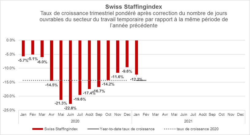 De novembre à janvier, le Swiss Staffingindex a enregistré une baisse des heures travaillées de 12,2 pour cent par rapport à la même période de l'année dernière. Le deuxième confinement se remarque déjà dans les chiffres commerciaux de l'intérim. Au quatrième trimestre de 2020, le recul était moins prononcé (9,6 pour cent). Malgré tout, cette baisse est plus faible que celle qui a été mesurée pendant le premier confinement. Cela montre que la branche et les milieux économiques se sont adaptés à la situation là où c'était possible.