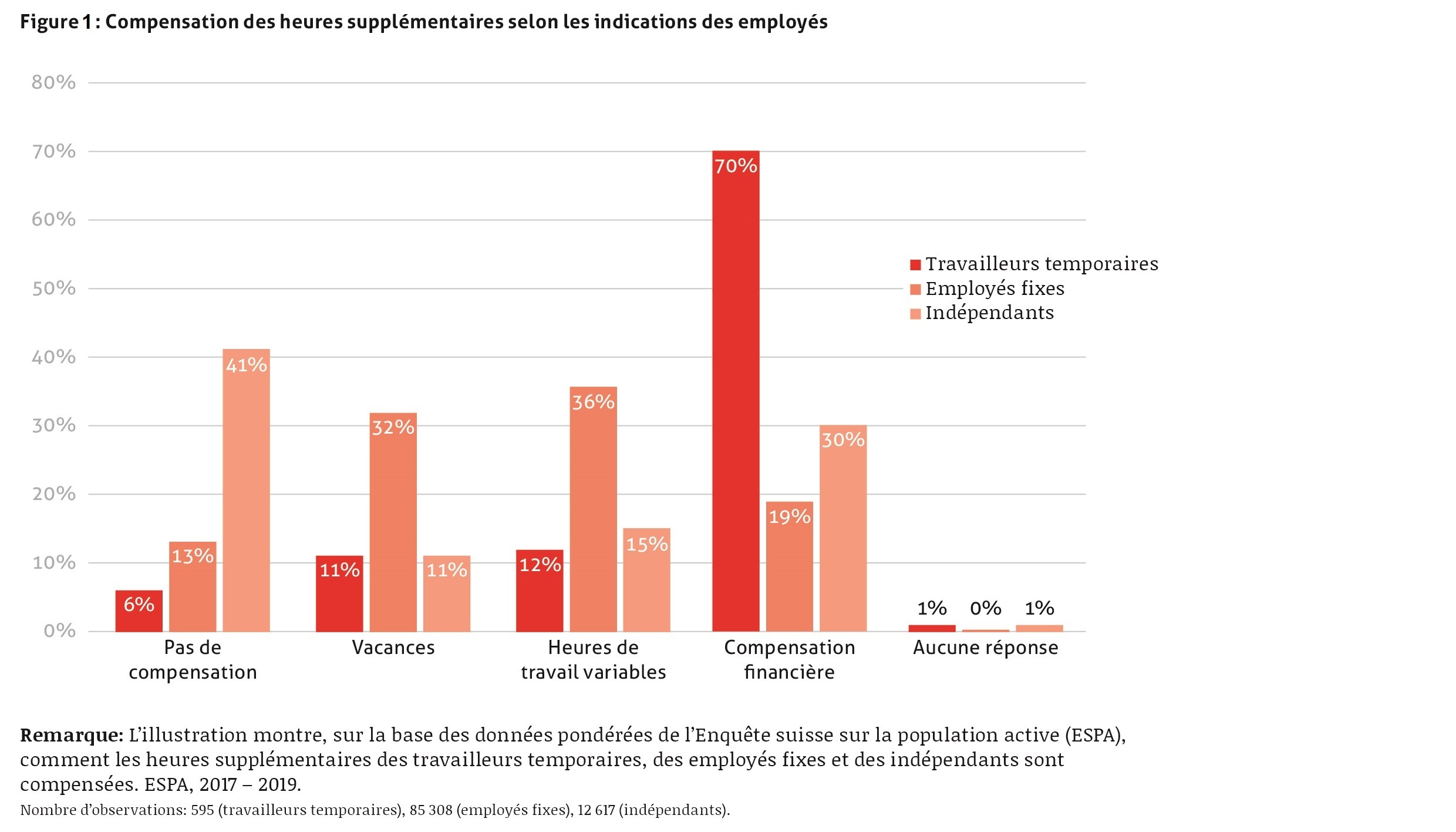 Les résultats révèlent que les travailleurs temporaires effectuent moins d'heures supplémentaires que leurs collègues employés fixes et qu'ils sont en outre plus facilement rémunérés pour le travail supplémentaire accompli. Tandis que seuls 28% des travailleurs temporaires déclarent effectuer des heures supplémentaires, ils sont 40% à être concernés chez les employés fixes et les indépendants. La figure 1 démontre comment les heures supplémentaires sont compensées auprès des travailleurs. Les employés fixes ont la possibilité de convertir leurs heures supplémentaires en heures de travail flexibles ou en congés, alors que les travailleurs temporaires se les font généralement rémunérer. Les travailleurs temporaires sont notamment plus souvent indemnisés pour leurs heures supplémentaires que les employés fixes. Seuls 6% des travailleurs temporaires indiquent n'avoir reçu aucun dédommagement pour les heures supplémentaires accomplies. Chez les employés fixes, cette proportion double et atteint 13%. Cela étant, une compensation plus fréquente des heures supplémentaires par du temps libre ou des congés pourrait également être très bénéfique pour la santé et la vie sociale des travailleurs temporaires. La simplification de cette démarche pourrait donc faire partie des objectifs communs à atteindre par les partenaires sociaux dans le cadre d'une prochaine CCT.