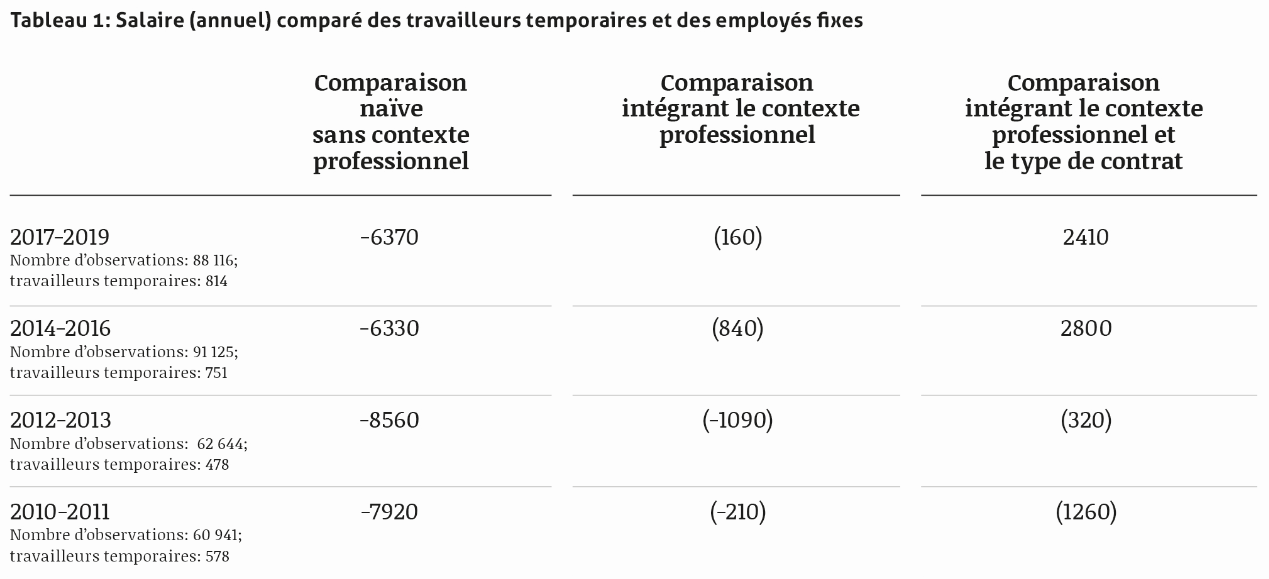 Pour mener à bien cette analyse, le White Paper a utilisé des méthodes statistiques similaires à celles appliquées pour calculer les différences de salaires entre hommes et femmes. Nous avons d'abord procédé à une comparaison des salaires annuels sans prise en compte du contexte professionnel et personnel entre les travailleurs temporaires et les employés fixes. Cette étude a fait ressortir une différence de salaire négative entre les deux groupes. Toutefois cette comparaison n'était pas équitable. Car les travailleurs temporaires et les employés fixes salariés dans les entreprises locataires se distinguent à bien des égards, par exemple par leur niveau de formation, leurs responsabilités en matière d'encadrement et leur expérience professionnelle générale. Si l'on tient compte de ces facteurs pour établir la comparaison entre les salaires, il apparaît que les travailleurs temporaires gagnent sensiblement autant que les employés fixes dans les entreprises locataires. Enfin, dans une dernière étape, l'analyse a également pris en considération le type de contrat détenu par les travailleurs temporaires et les employés fixes, à savoir à durée déterminée ou indéterminée. Lorsque ce paramètre est pris en compte, il apparaît que les travailleurs temporaires gagnent sensiblement plus que les employés fixes.