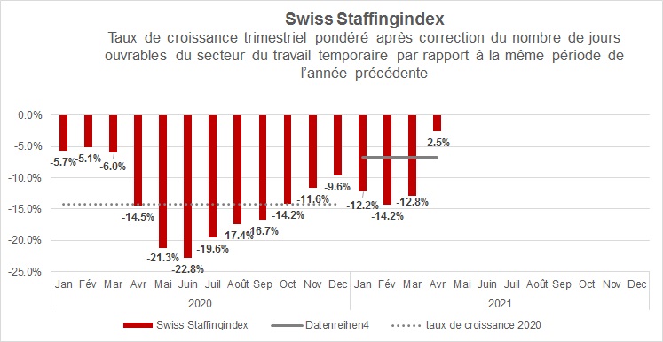 De février à avril, le Swiss Staffingindex a enregistré une baisse des heures travaillées de 2,5 pour cent par rapport à la même période de l'année dernière. Depuis le début de l'année, le résultat négatif est de 6,7 pour cent. Les premières mesures visant à combattre le coronavirus ont été mises en place en mars 2020. La période de référence se trouve donc presque complètement dans la phase de crise. Le résultat négatif concernant la croissance de la branche s'est nettement réduit. Il pourrait bientôt se situer à nouveau dans les chiffres positifs si la situation économique retrouve des couleurs.