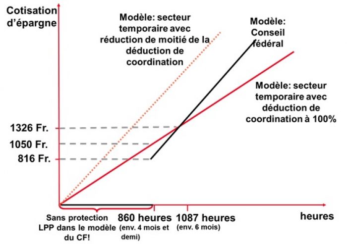 La situation devient tout à fait absurde lorsque l'on considère les travailleurs temporaires. Pour eux, il existe déjà depuis des années un modèle d'assurance spécialement développé pour éviter les lacunes: pour les travailleurs temporaires, les critères de la LPP sont convertis en salaire horaire. Le seuil d'entrée est de 9,85 francs et la déduction de coordination est de 11,45 francs par heure. En pratique, cela signifie que les travailleurs temporaires peuvent être assurés au titre de la LPP dès la première heure de travail. En effet, leur salaire minimum est bien supérieur au seuil d'entrée de 9,85 francs par heure. Dans leur cas, la différence entre le salaire horaire et la déduction de coordination de 11,45 francs par heure est assurée1.