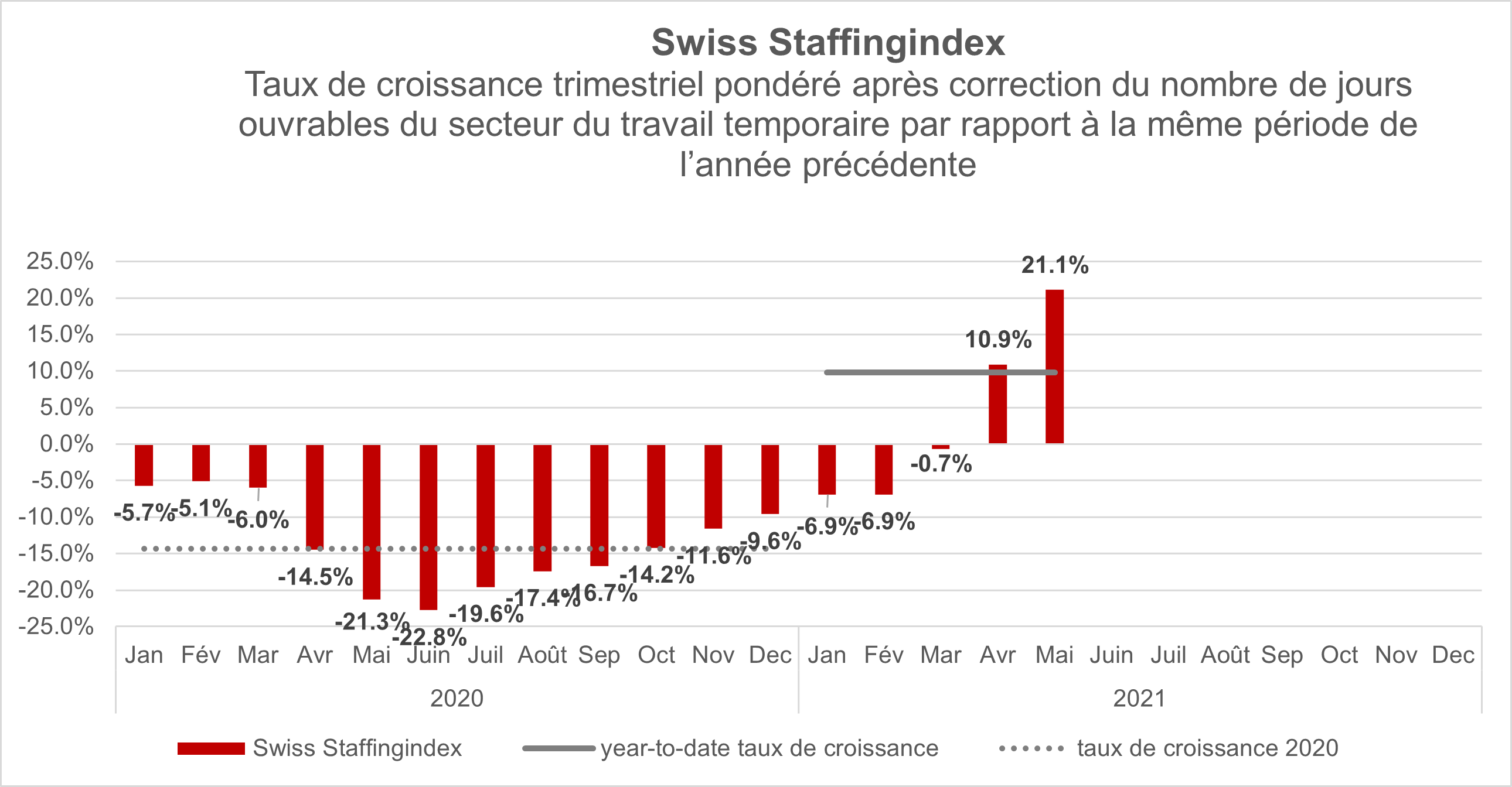 Avec 21,1 pour cent, le Swiss Staffingindex a enregistré une nette croissance. Les mois de mars à mai sont comparés avec la même période de l'année dernière. Cette évolution soudaine peut surprendre. Elle s'explique par une erreur technique lors de la livraison des données. Les chiffres concernant les heures étaient trop bas depuis le début de l'année. Les nouvelles valeurs montrent qu'en mars déjà, notre branche se trouvait légèrement en dessus du niveau de l'année dernière et qu'elle a déjà enregistré une nette croissance entre-temps. Depuis le début de l'année, la branche a connu une croissance de 9,8%.