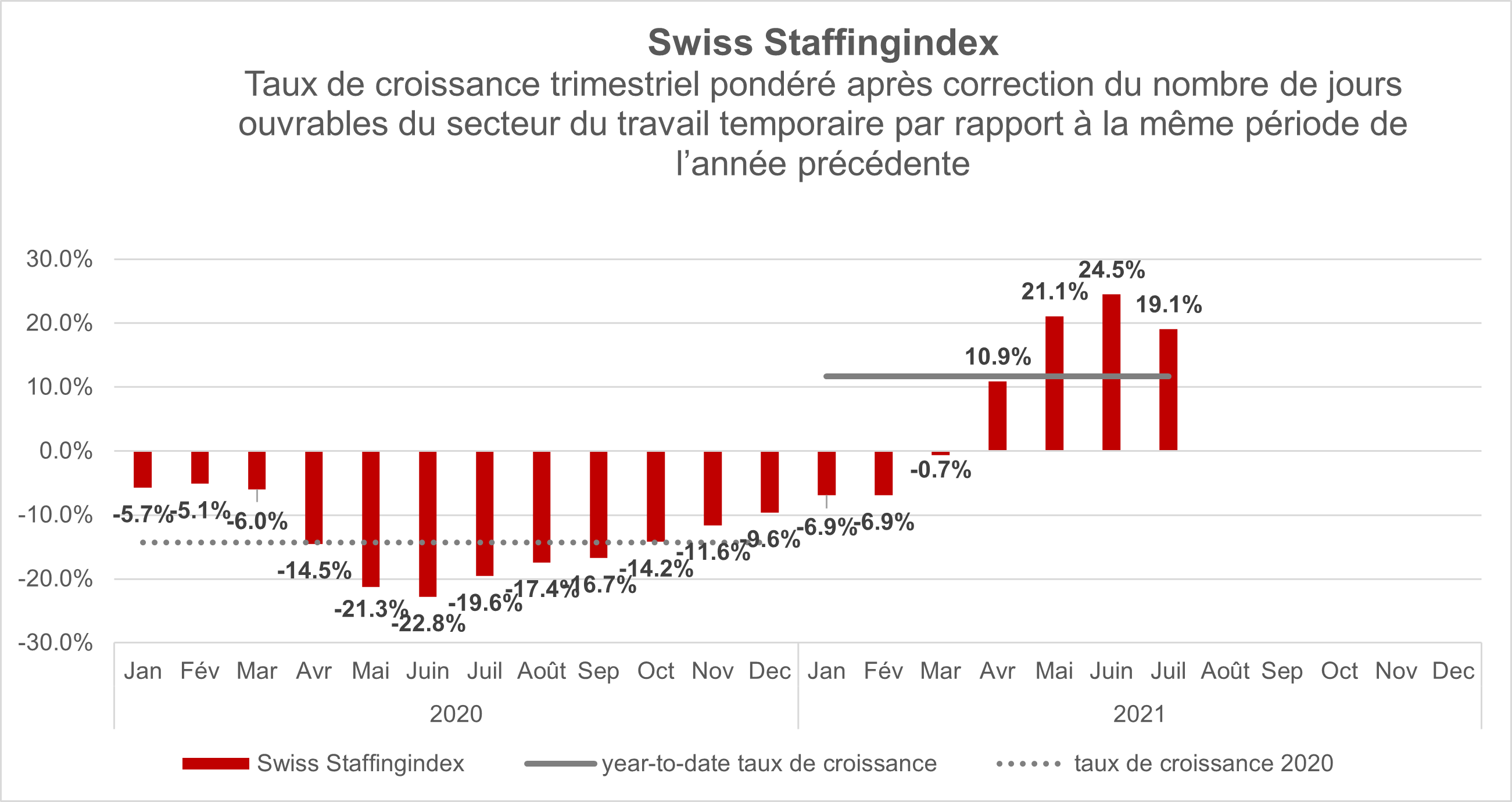 Dans notre branche, la tendance à la hausse se poursuit. En juillet, le Swiss Staffingindex a augmenté de 19,1 pour cent par rapport à la même période de l'année dernière. À première vue, la croissance spectaculaire du deuxième trimestre semble s'être ralentie. Notons cependant qu'elle résultait de la comparaison avec les mêmes mois de l'année précédente, lors du confinement, pendant lesquels l'index a enregistré un niveau très bas. Le Swiss Staffingindex actuel se réfère aux mois de l'année dernière qui ont suivi le déconfinement, alors qu'une légère reprise était déjà en cours.