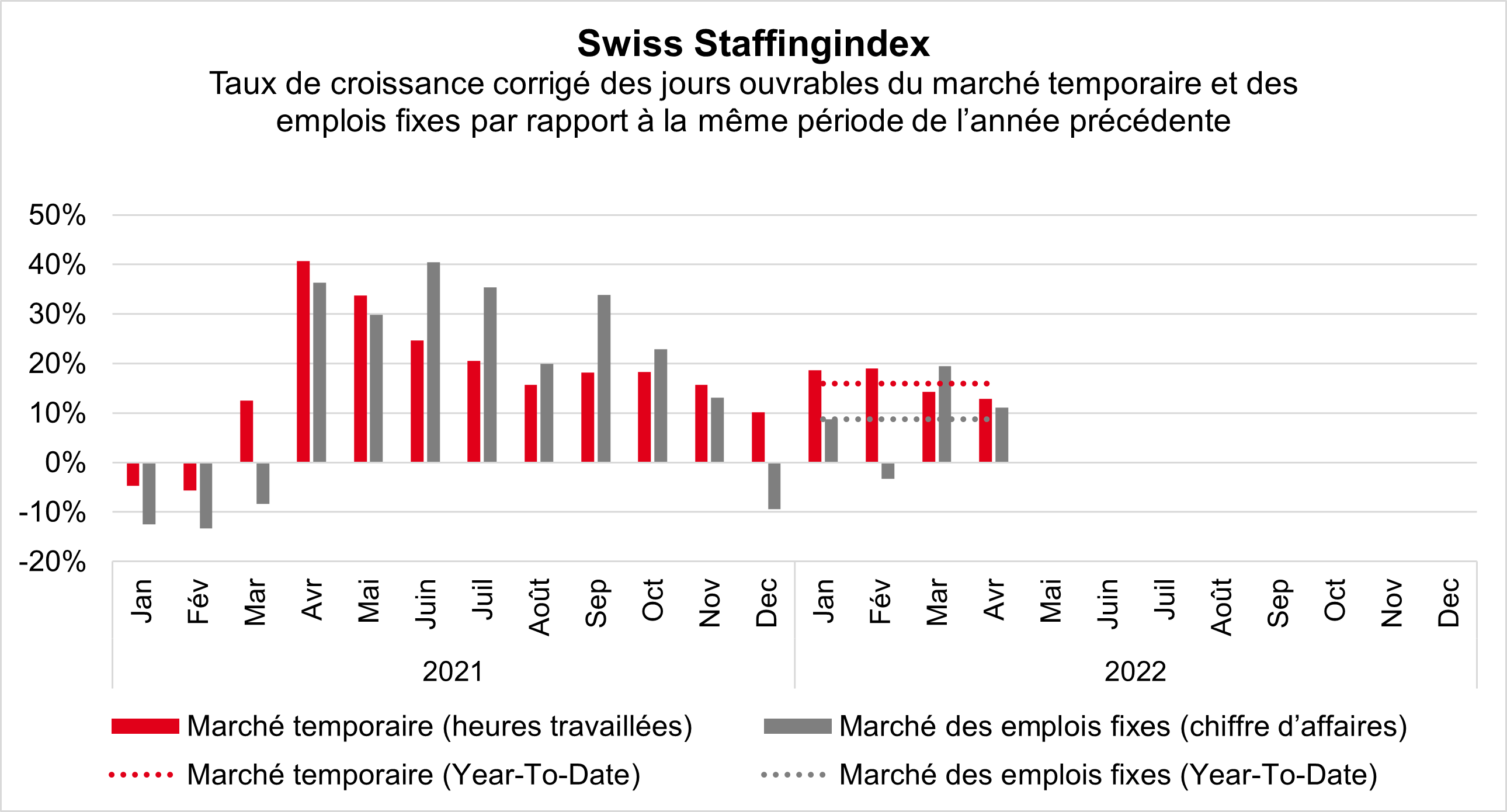 Le secteur du travail temporaire a connu une forte évolution en avril 2022. Les heures travaillées ont augmenté de 12,9% sur le marché temporaire par rapport au même mois de l'année précédente. Le chiffre d'affaires lié aux placements fixes dépasse de 11,1% celui de l'année dernière. L'augmentation des risques économiques mondiaux tels que la guerre en Ukraine, les problèmes de livraison en provenance de Chine et la hausse des taux d'intérêt n'ont pas encore freiné l'évolution positive du marché.