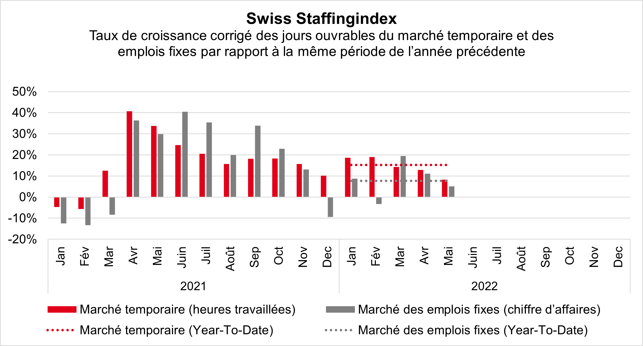 Le secteur du travail temporaire ralentit en mai 2022. Les heures travaillées ont augmenté de 8,4% sur le marché temporaire par rapport au même mois de l'année précédente. Le chiffre d'affaires réalisé avec ces placements en emplois fixes a augmenté de 4,7%. Les performances year-to-day de 14,0% pour le marché temporaire et de 7,5% pour le marché de l'emploi fixe sont sensiblement supérieures aux valeurs mensuelles actuelles. Eu égard à la hausse des prix de production, aux difficultés croissantes de livraison et au nombre toujours plus faible de demandeurs d'emploi, ce ralentissement n'a rien de surprenant.