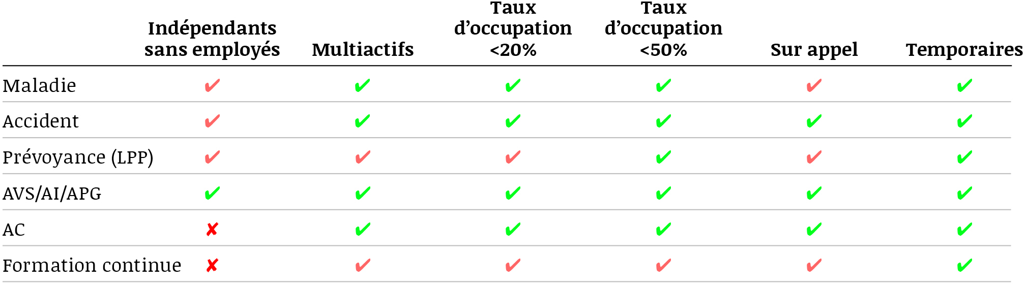 Pour les indépendants, certaines assurances ne sont pas obligatoires (prévoyance/LPP), ne peuvent pas être souscrites (assurance chômage) ou sont presque impossibles à financer (assurance indemnités journalières en cas de maladie). Les personnes exerçant plusieurs emplois, quant à elles, risquent de graves défauts d'assurance dans le domaine de la prévoyance professionnelle (caisse de pension) en raison du seuil d'entrée LPP de CHF 21 510 et de la déduction de coordination. La prévoyance professionnelle garantit le niveau de vie à la retraite et couvre les risques d'invalidité et de décès. Un état de fait auquel les personnes ayant un faible taux d'occupation ou travaillant sur appel sont également confrontées. Il arrive d'ailleurs bien souvent que ces dernières ne soient pas assurées contre la maladie.