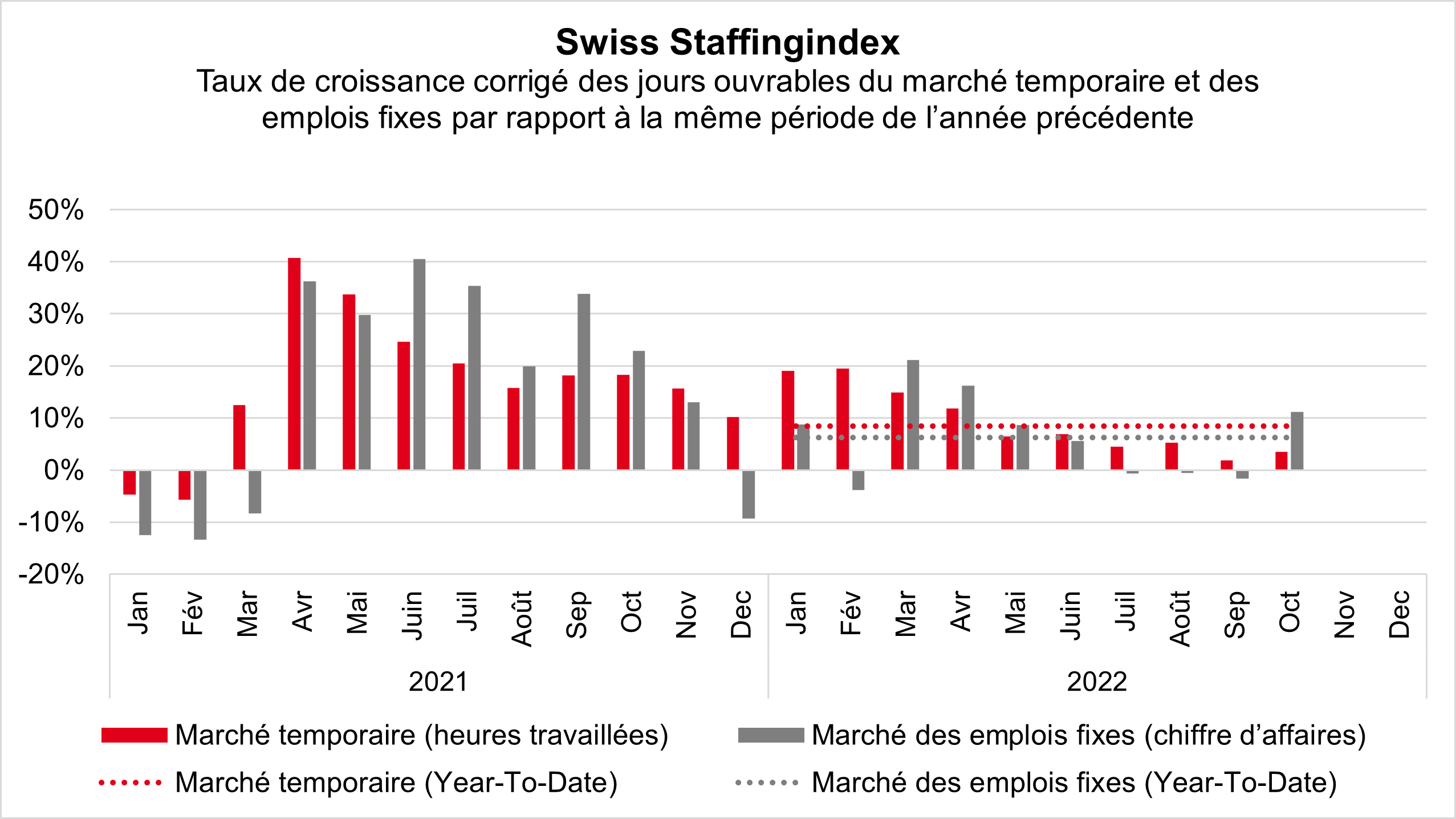 L'évolution des activités fixes et temporaires s'inscrit dans la conjoncture actuelle. Certes, la banque Raiffeisen considère qu'il existe des risques conjoncturels pour la Suisse également. Cependant, le développement économique reste robuste par rapport à l'Union européenne, à l'Asie et aux États-Unis (Perspectives placements vovembere 2022 (raiffeisen.ch)). Cela se ressent également sur le marché du travail suisse: les chiffres du chômage restent bas. On constate une pénurie de main-d'œuvre et de spécialistes. La banque Raiffeisen considère de manière particulièrement critique l'évolution du secteur industriel qui, selon l'indice des directeurs d'achats de cette banque, est clairement moins optimiste (Raiffeisen PMI PME – octobre 2022).