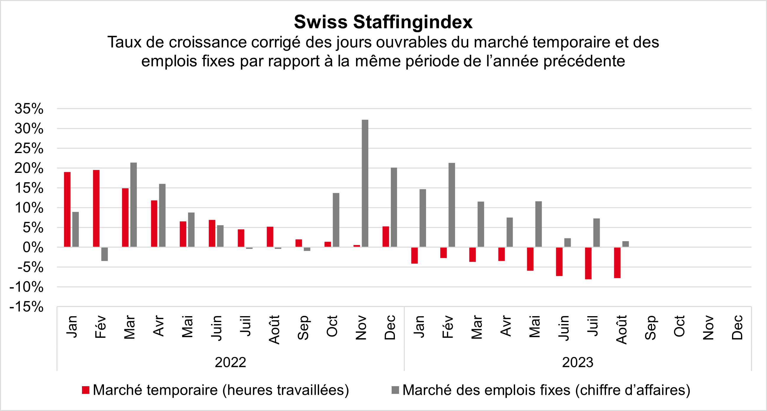Le Swiss Staffingindex le montre: avec une baisse de 7,8 pour cent, l'activité commerciale est en net recul sur le marché de l'intérim. Cependant, le marché des postes fixes est dans le vert avec une hausse de 1,5 pour cent. Notre index reflète donc le développement économique actuel. La pénurie de main-d'œuvre constitue un défi majeur pour notre branche en particulier et pour l'économie en général. Ce manque de personnel rend le recrutement difficile dans le secteur de l'intérim. Quant au ralentissement économique, qui ne s'est pas encore répercuté sur l'ensemble du marché du travail, il pèse aussi sur l'activité des postes fixes.