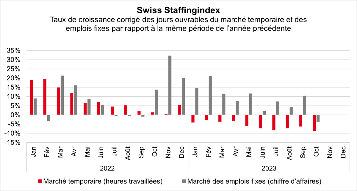 En octobre, le marché temporaire, comme celui des emplois fixes, ont accusé un recul net. Les heures travaillées dans le cadre de la location de services ont diminué de 8,7 pour cent par rapport au même mois de l'année précédente. Le chiffre d'affaires réalisé avec les placements en emplois fixes a baissé de 4 pour cent. Autant d'indices révélateurs d'un changement de situation sur le marché. Le ralentissement de l'économie touche le marché du travail et conduit à de mauvais chiffres dans les deux secteurs d'activité des prestataires des services de l'emploi.