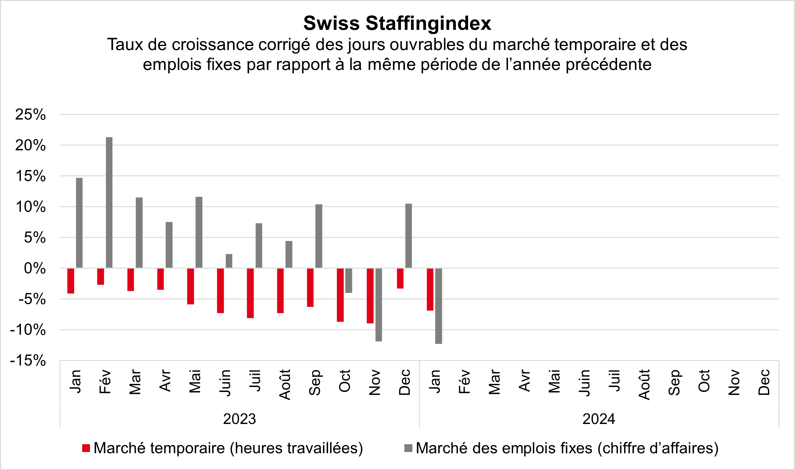 Le marché des emplois temporaires et fixes enregistre un début d'année plus que mitigé. En janvier, les heures travaillées dans le cadre de la location de services ont diminué de 6,9 pour cent par rapport au même mois de l'année précédente. Quant au chiffre d'affaires réalisé avec les placements en emplois fixes, il a baissé de 12,3 pour cent. L'essoufflement de la conjoncture finit donc par peser sur le marché temporaire: le ralentissement de l'économie touche le marché du travail et conduit à de mauvais chiffres dans les deux secteurs d'activité des prestataires des services de l'emploi.