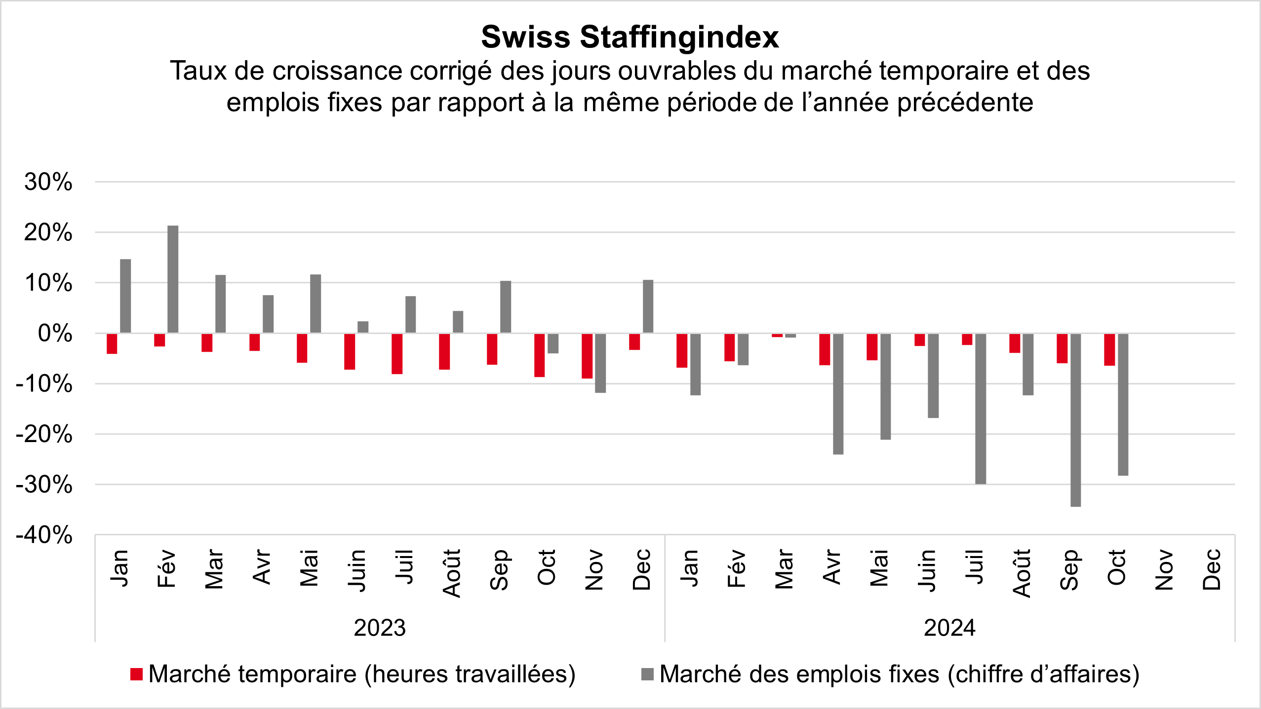 En octobre, le marché du travail temporaire s'est de nouveau assombri. Avec un recul de 6,5% par rapport à l'année dernière, la baisse s'accentue par rapport aux mois précédents. Les emplois fixes sont encore plus touchés. Le marché a reculé de 28,3% le mois dernier. Les chiffres dans le rouge sur les deux sous-marchés sont le reflet du ralentissement économique actuel.