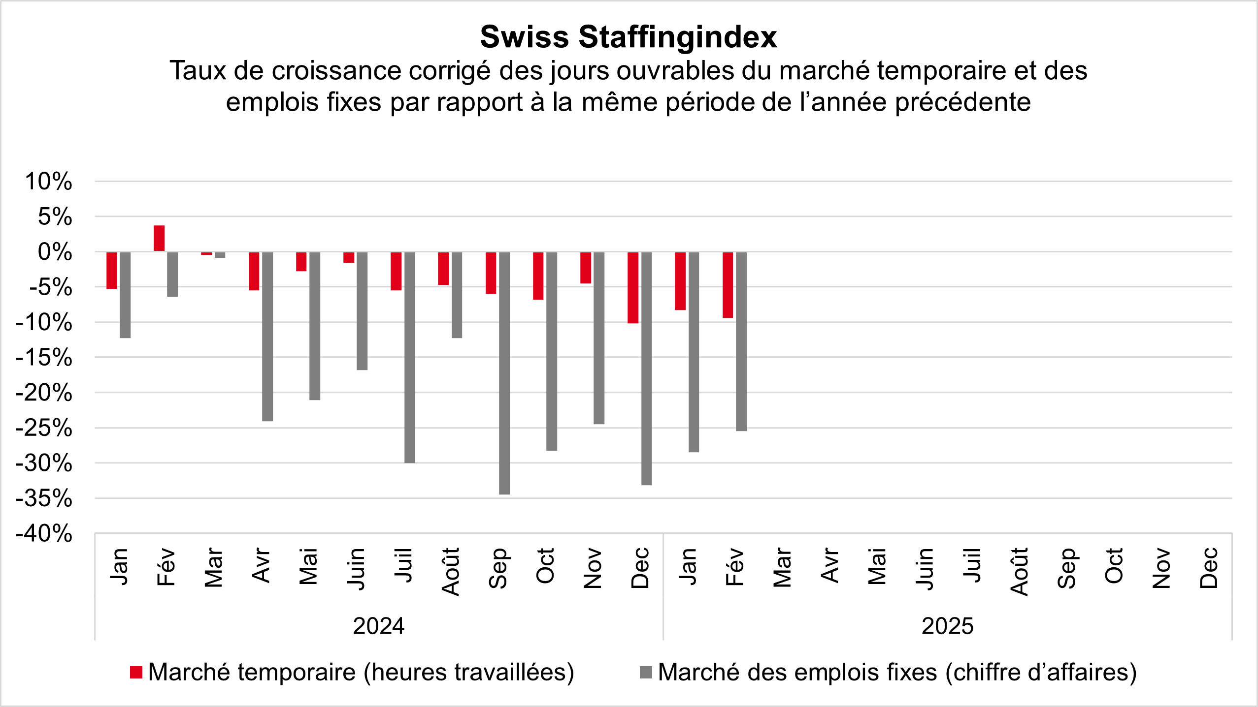 En février, le marché des prestataires de services de l'emploi a enregistré un net recul. Par rapport au même mois de l'année précédente, les heures de travail dans le secteur temporaire ont diminué de 9,4 pour cent. Le chiffre d'affaires réalisé avec les placements en emplois fixes a baissé de 25,5 pour cent. Le marché des prestataires de services de l'emploi reste donc sous tension et reflète l'environnement conjoncturel exigeant ainsi que l'appauvrissement persistant du marché du travail dans les métiers en pénurie.