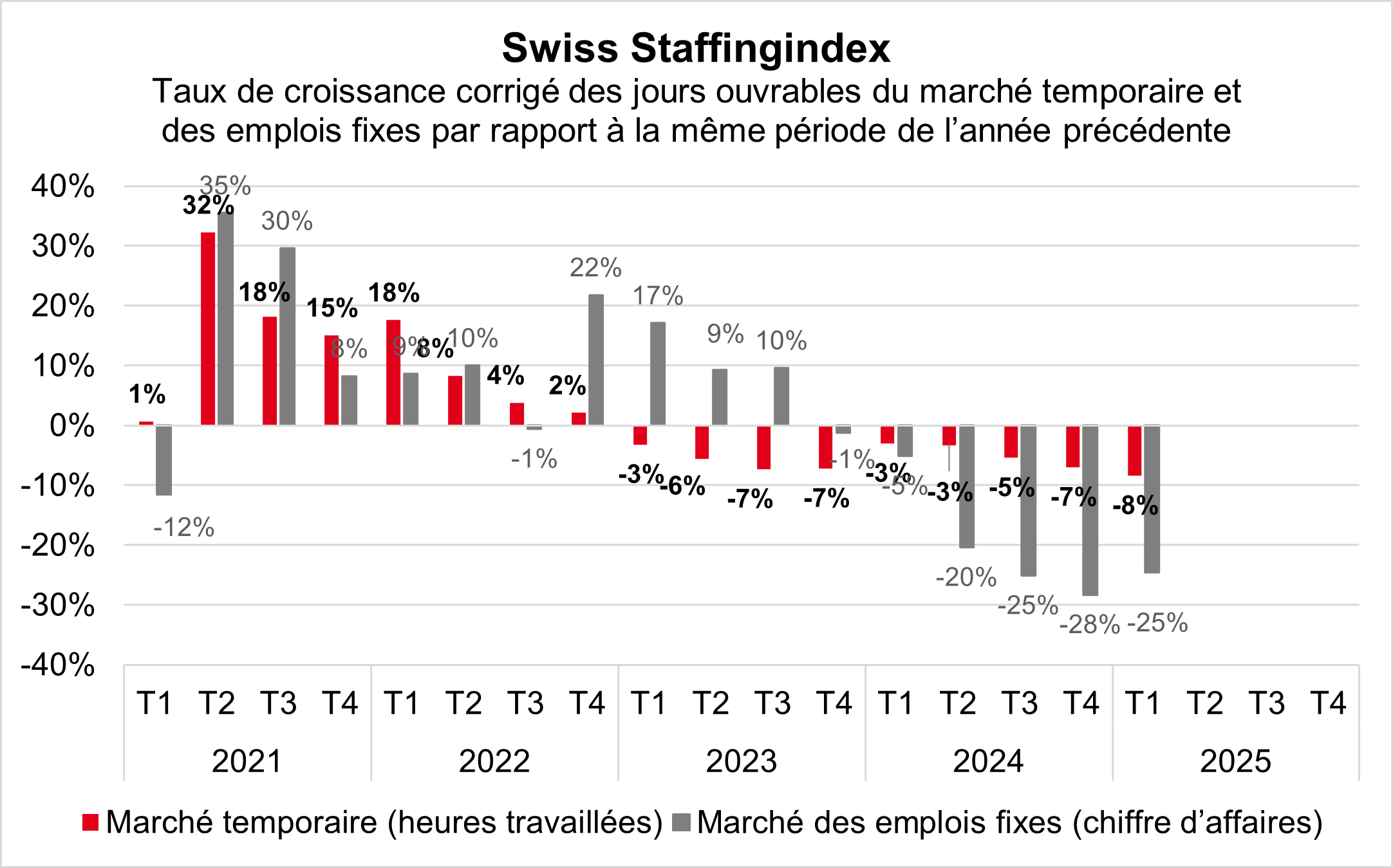 Les prestataires de services de l'emploi ont enregistré un premier trimestre 2025 négatif. Sur le marché temporaire, l'exercice commence avec de mauvais chiffres pour la troisième année consécutive. En ce qui concerne la location de services, les heures de travail fournies ont diminué de 8,4 pour cent. Le marché des emplois fixes, quant à lui, a chuté de 24,6 pour cent. En tant que secteur traditionnellement sensible à la conjoncture, les prestataires de services de l'emploi ressentent donc tout particulièrement les effets de l'incertitude économique ambiante. La politique douanière américaine menée par l'actuel président Donald Trump vient alimenter le phénomène, à un moment où la conjoncture ralentit de toute façon et où les risques géopolitiques restent importants.