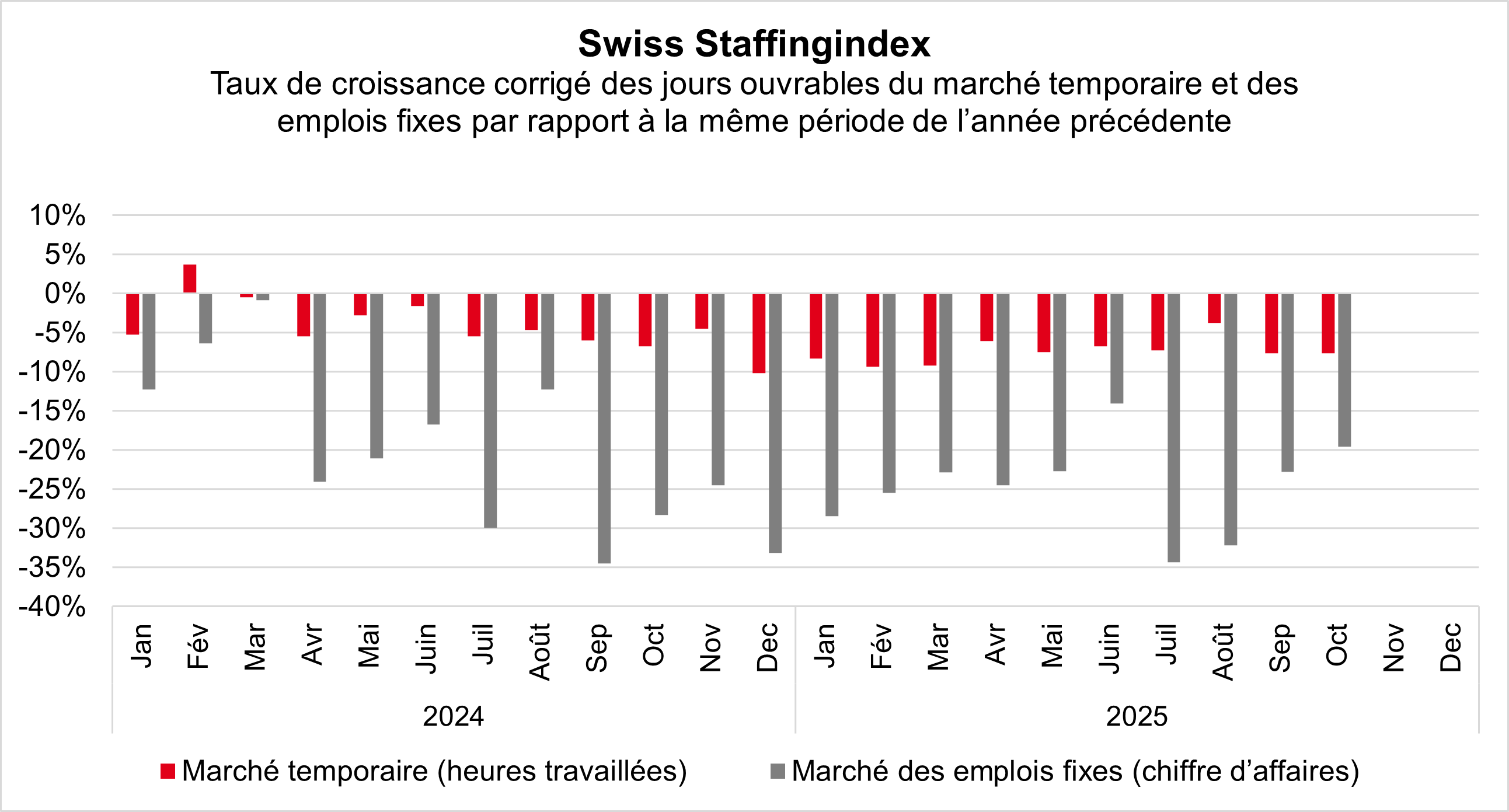 Cette morosité correspond aux dernières estimations rapides du SECO concernant la croissance du PIB au 3e trimestre. L'économie suisse a subi un recul de 0,5 pour cent, dû à la détérioration du secteur industriel, notamment de l'industrie pharmaco-chimique. Le secteur des services a lui aussi connu une évolution inférieure à la moyenne. L'affaiblissement de l'industrie devrait tout particulièrement peser sur les affaires des prestataires de services de l'emploi.