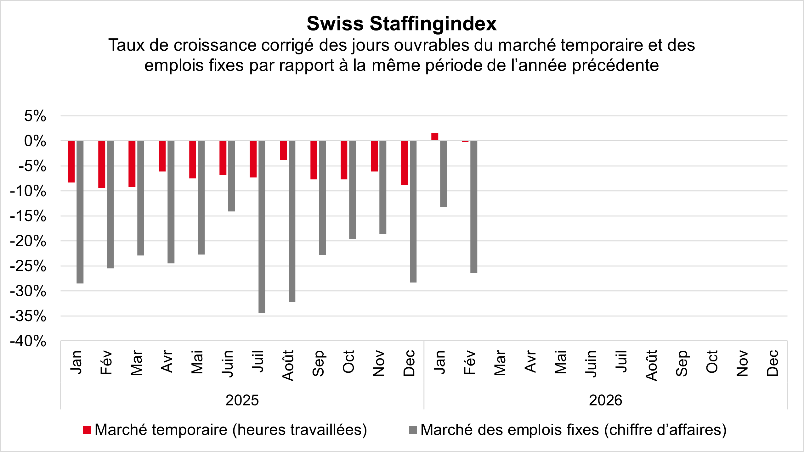 En février, le marché du travail temporaire a perdu de son élan. Les heures travaillées ont diminué de 0,2 pour cent par rapport au même mois de l'année précédente, signe d'une stabilisation naissante. La situation reste difficile en revanche sur le marché des emplois fixes, qui enregistre un recul de 26,4 pour cent. L'incertitude économique persistante pèse sur les entreprises locataires et les incite à la prudence en matière de recrutements permanents.