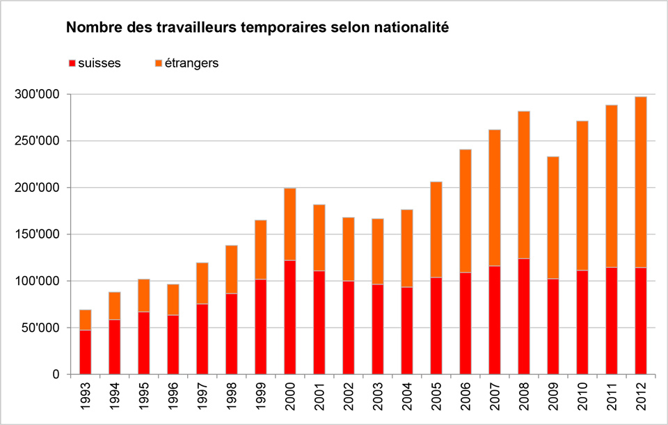 Le pourcentage des étrangers parmi les intérimaires a de nouveau augmenté en 2012 pour s'établir à 62% (graphique 1). Mais la proportion d'étrangers dans l'ensemble de la population active suisse est elle de 24%. Les services de l'emploi soutiennent de plus en plus intensément les entreprises suisses dans le recrutement de la main d'oeuvre spécialisée, qui est rare dans notre pays. Comme le démontre une étude mandatée par swissstaffing et exécutée par l'Université de Neuchâtel au sujet de la migration, l'immigration permet de pourvoir des postes de travail pour lesquels la main d'oeuvre indigène fait défaut. La comparaison des profils des nouveaux immigrants avec ceux des Suisses débutant dans la profession montre que, l'un dans l'autre, les deux groupes se complètent et ne se concurrencent pas. Le Seco en arrive à la même conclusion dans son 9e rapport de l'Observatoire sur la libre circulation des personnes sur le marché suisse du travail.