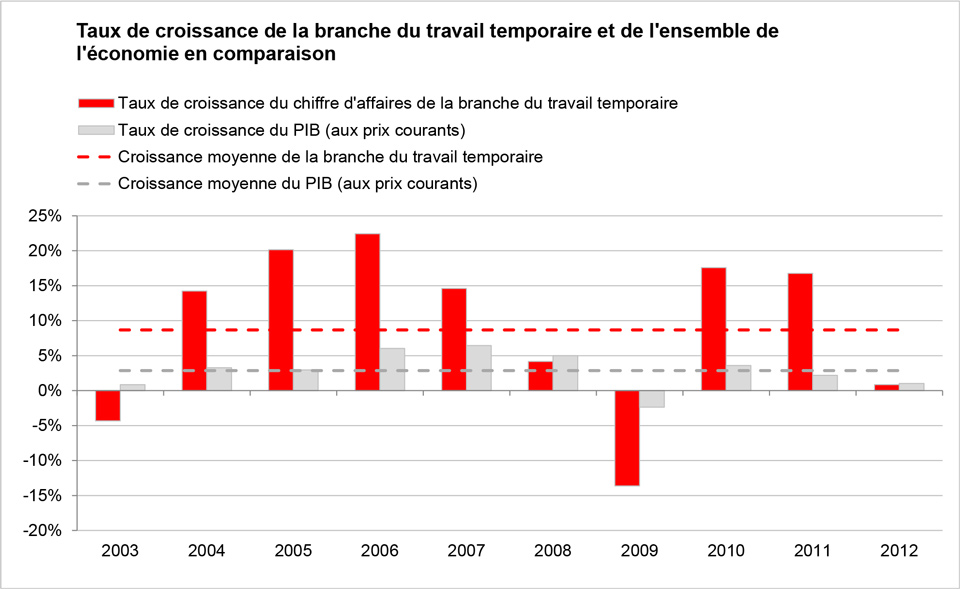 "La tendance au travail intérimaire est ininterrompue" déclare Georg Staub, directeur de l'association des services de l'emploi swissstaffing. Malgré le contexte difficile pour l'économie dans sa globalité, la branche de l'intérim s'en est encore bien tirée en 2012. Si le volume des heures d'engagement s'est légèrement réduit (à raison de 3.8%), il y a eu tout de même une augmentation de 3.1% du nombre des travailleurs temporaires par rapport à l'année antérieure. A eux tous, ils ont réalisé une masse salariale de près de 4.4 milliards de francs, ce qui équivaut à une croissance de 0.9%. En moyenne, la branche temporaire a crû depuis 2003 à concurrence de 8.7% par an (graphique 2). Le produit intérieur brut a connu durant la même période une croissance annuelle moyenne de 2.9%.