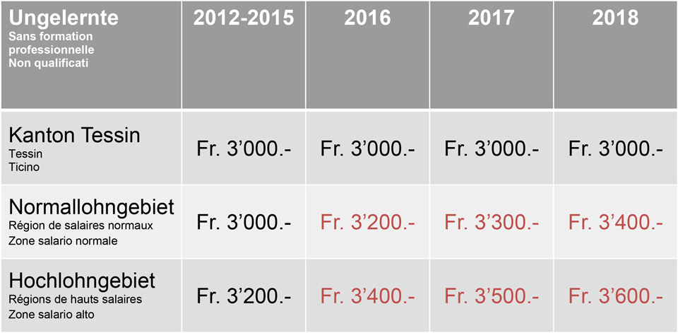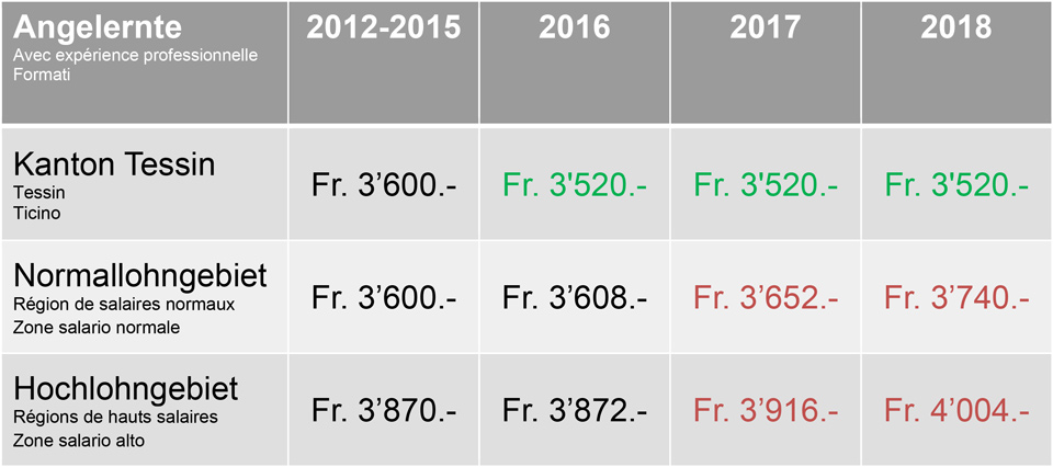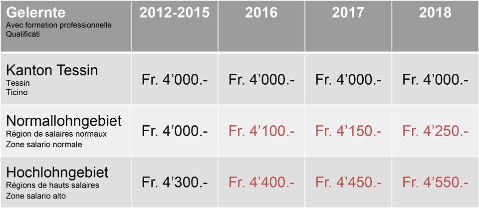 - Augmentation progressive des salaires minimums de respectivement 400 francs par mois pour collaborateurs sans formation professionnelle et de 250 francs par mois pour les collaborateurs avec formation, en Suisse alémanique et en Romandie.