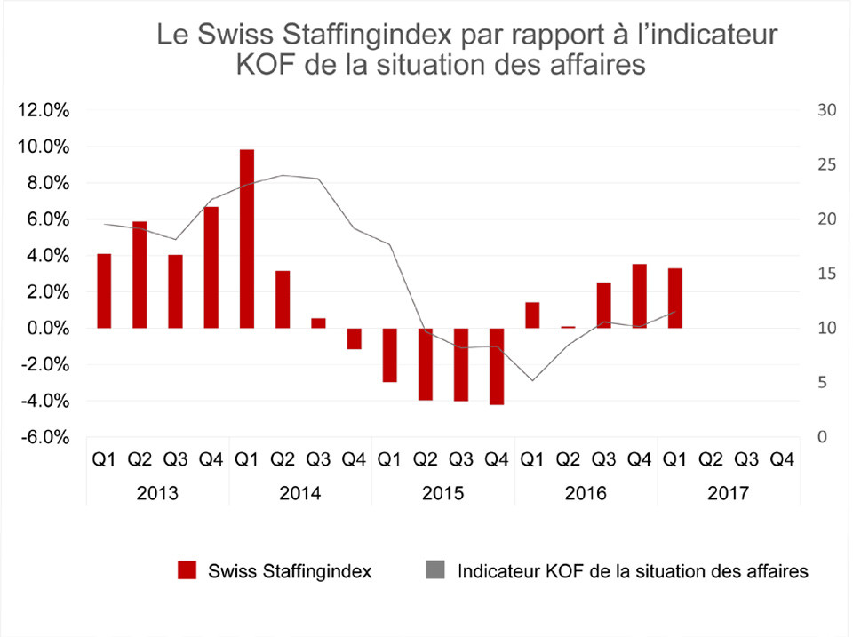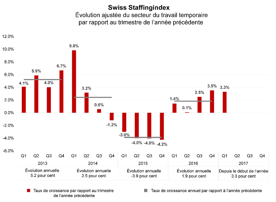 «La progression de 3,3 % lors du premier trimestre nous rend optimistes quant à l'évolution du secteur du travail temporaire en 2017», rapporte Marius Osterfeld, économiste chez swissstaffing. «L'économie continue de gagner du terrain. Chez swissstaffing, nous observons avec inquiétude les efforts grandissants de réguler le marché du travail suisse flexible. La croissance encore fragile serait très facilement étouffée par un monstre administratif tel que l'obligation d'annonce des postes vacants, tout comme la mise en oeuvre des nombreuses idées de régulation des syndicats.» L'évolution future du secteur du travail temporaire et de l'ensemble de l'économie se montrera tous les trimestres avec le Swiss Staffingindex.