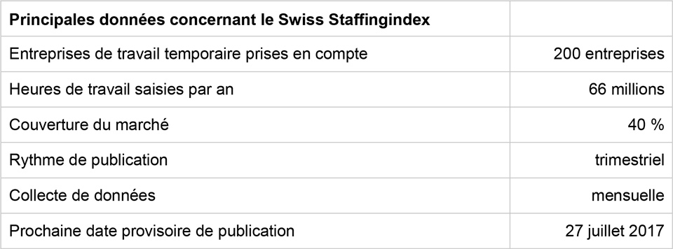 Le nouveau Swiss Staffingindex regroupe les heures de travail de près de 200 entreprises suisses locataires de services dans un indice destiné au marché du travail temporaire. Parmi ces entreprises comptent les grands noms du secteur comme Adecco Ressources Humaines SA, Manpower SA, Randstad Suisse SA, Kelly Services Suisse SA, Interiman Group Holding SA, dasteam ag ou Bellini Personal AG. Avec 66 millions d'heures de travail effectuées, le nouvel indice couvre 40 % du marché suisse du travail temporaire, notamment grâce aux nombreuses données provenant de petites PMU, en parallèle des grandes entreprises. Grâce aux solutions logicielles innovantes de Ralisator, M&D Solutions, Softside et btv-data, les grandes et petites entreprises de travail temporaire en Suisse peuvent définir de manière rapide et simple le salaire minimum correct et les assurances sociales adéquates pour les travailleurs temporaires. Ceci inspire un sentiment de sécurité aux travailleurs temporaires et aux entreprises, et le transfert de données automatisé procuré par des fournisseurs de logiciels à une instance neutre a donné naissance au Swiss Staffingindex. Celui-ci livre des données fiables au niveau maximal de qualité.