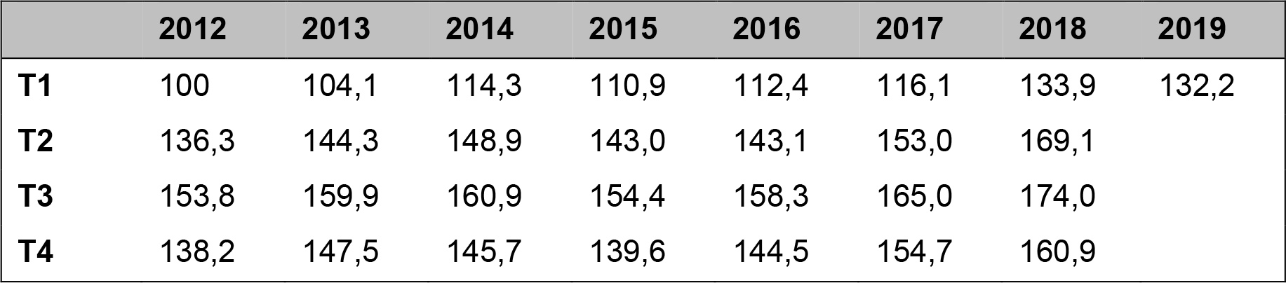 Aperçu de l'évolution du Swiss Staffingindex, référence: T1 2012