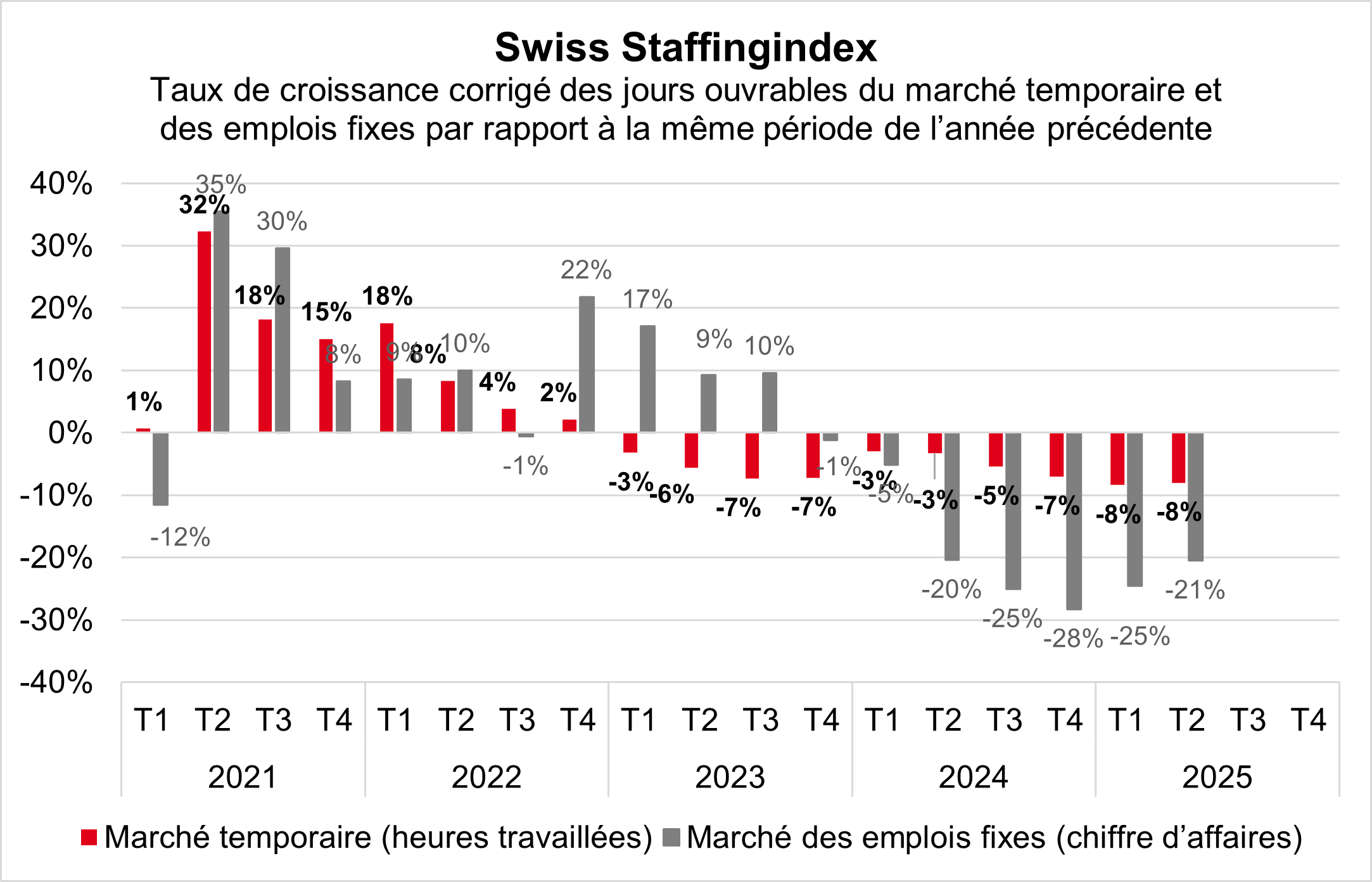 Pour la troisième année consécutive, les prestataires de services de l'emploi clôturent le premier semestre dans le rouge. Les heures travaillées des travailleurs temporaires ont chuté de 8,8 pour cent au premier semestre. Le marché des emplois fixes, quant à lui, a chuté de 22,8 pour cent par rapport à l'année précédente. Par rapport aux années précédentes, la tendance à la baisse s'est accélérée sur ces deux sous-marchés. Les prestataires de services de l'emploi souffrent du ralentissement conjoncturel mondial. L'incertitude économique accrue pèse notamment sur les investissements et sur le marché du travail.