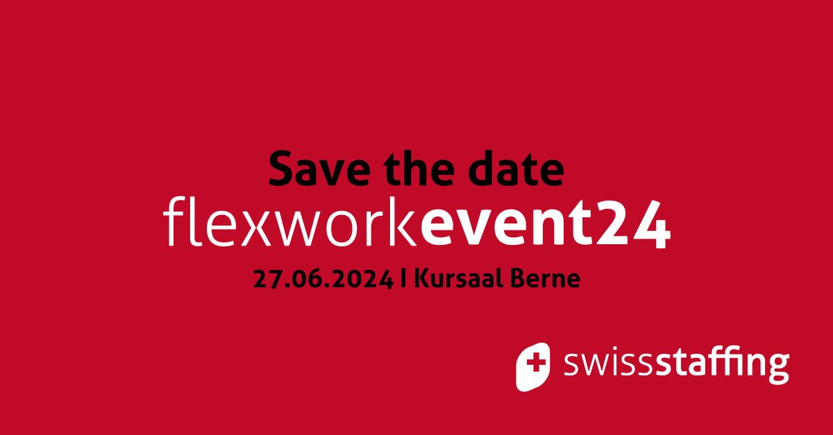 Le prochain rendez-vous important aura lieu trois mois plus tard avec l'événement Flexwork de swissstaffing. Le sujet «Flexwork: Désir versus réalité» nous occupera tout l'après-midi avec des invités de marque. Réservez dès aujourd'hui votre après-midi du 27 juin 2024. Réjouissez-vous de la présentation keynote du professeur Wolfgang Jenewein, professeur titulaire à l'Université de Saint-Gall et propriétaire gérant de Jenewein AG.