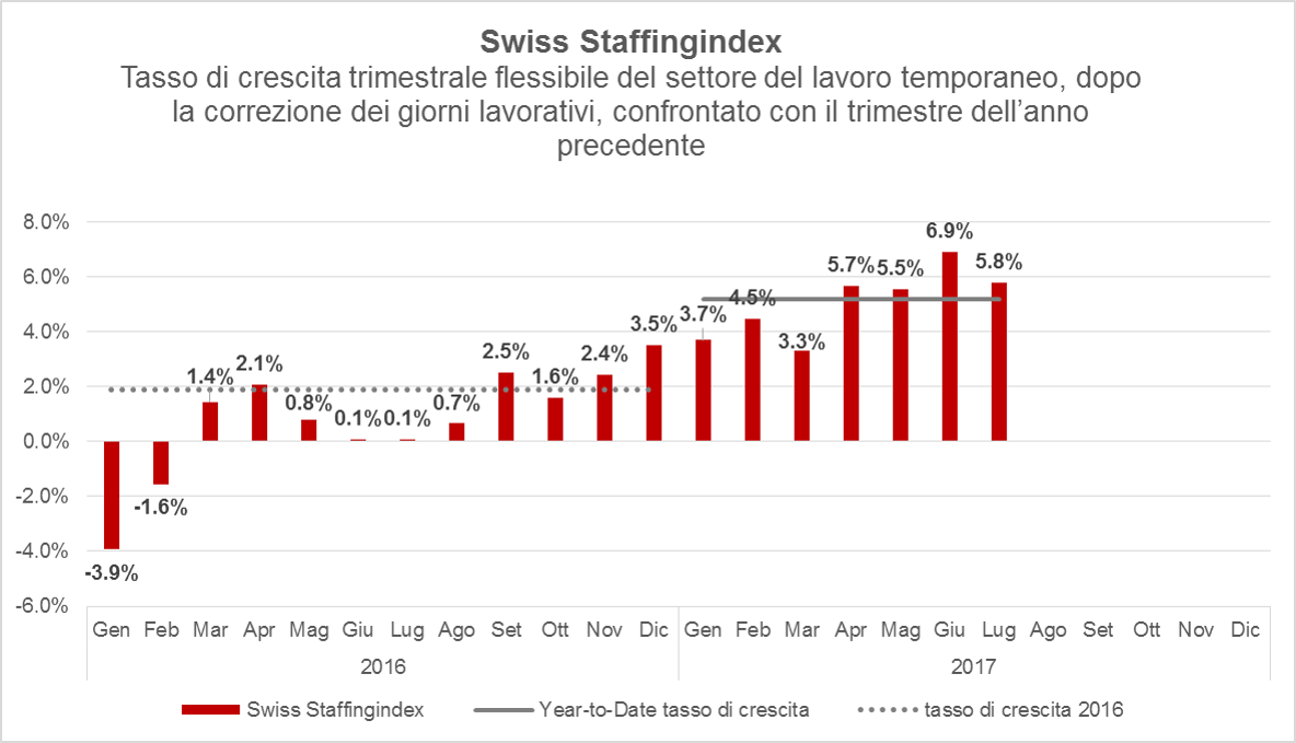 Dall'inizio dell'anno il numero delle ore di lavoro è aumentato del 5.2% rispetto all'anno precedente. Constatiamo un aumento del 5.8% conglobando i tre mesi di maggio, giugno e luglio. Il settore del lavoro temporaneo continua a crescere e rispecchia il successo dell'economia svizzera nel suo insieme.