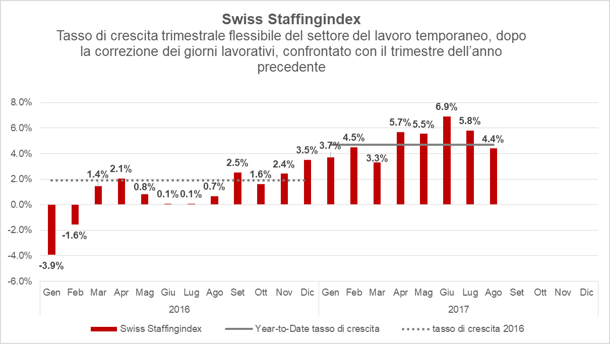 Nel mese di agosto la crescita dello Swiss Staffingindex ha perso slancio. Grazie a un 4,4 per cento in più di ore di lavoro rispetto ai mesi giugno, luglio e agosto dello scorso anno, l'attività continua a svilupparsi in modo stabile. A partire dall'inizio dell'anno il tasso di crescita attuale per il settore corrisponde al 4,7 per cento.