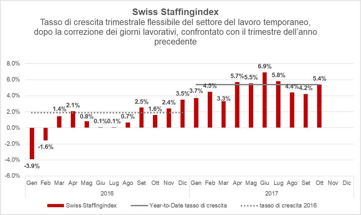 5,4% è la percentuale del mese per il settore temporaneo. Di tanto è infatti aumentato lo Swiss Staffingindex negli ultimi tre mesi rispetto allo stesso periodo dell'anno precedente, e altrettanto è cresciuto il settore dall'inizio dell'anno, sempre rispetto al 2016. Si conferma pertanto la progressione dinamica osservata negli ultimi mesi.