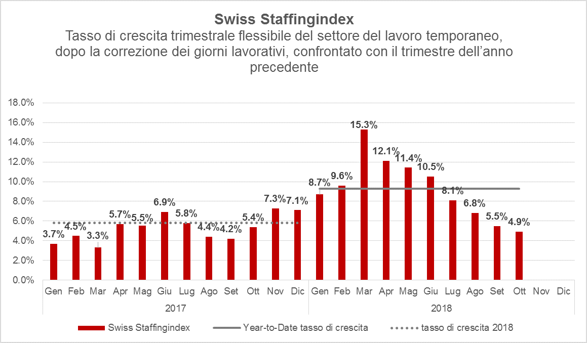 Nel periodo da agosto a ottobre il settore del lavoro temporaneo è cresciuto del 4,9 % rispetto allo stesso periodo del precedente esercizio. Dall'inizio dell'anno il numero di ore lavorate è aumentato del 9,3 %. Ciò significa che la crescita del settore continua a perdere slancio.