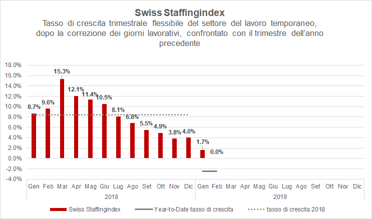 Dall'inizio dell'anno, il numero delle ore di impiego aggiustato secondo i giorni lavorativi è calato del 2,5%. Lo Swiss Staffingindex, che confronta gli ultimi tre mesi con lo stesso periodo nell'anno precedente, riporta uno zero negativo in considerazione dei buoni valori dicembrini. Senza un sorprendente aumento dell'attività nel mese di marzo, tuttavia, la crescita nel primo trimestre potrebbe avere il segno meno.