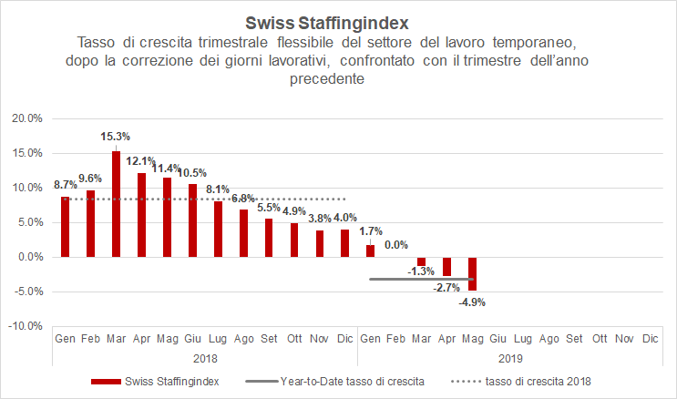 Secondo la media mobile degli ultimi tre mesi, le ore di impiego nel settore temporaneo sono calate del 4,9% rispetto all'anno scorso. Se si confronta invece lo sviluppo dall'inizio dell'anno con le cifre del 2018, la contrazione è del 3,2%. Si accentua pertanto la tendenza negativa nel settore, originata dalla debole crescita economica generale.