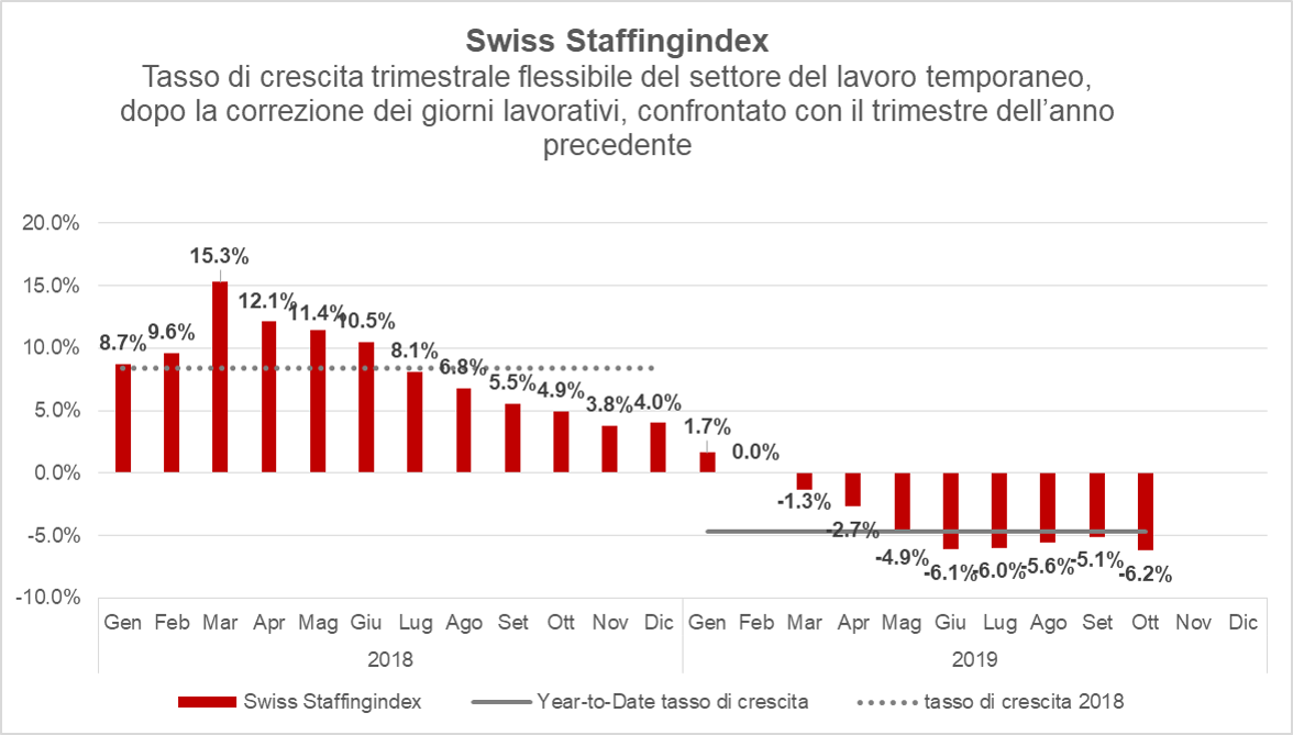 Secondo lo Swiss Staffingindex, negli ultimi tre mesi le ore di impiego sono calate del 6,2% rispetto all'anno precedente. Dall'inizio dell'anno, la contrazione rispetto al 2018 è del 4,7%. Il contesto di mercato del settore temporaneo resta pertanto difficile, anche se al momento non si delinea all'orizzonte un ulteriore peggioramento. Le cifre rosse nel nostro settore sono una conseguenza diretta dell'indebolimento della congiuntura globale.