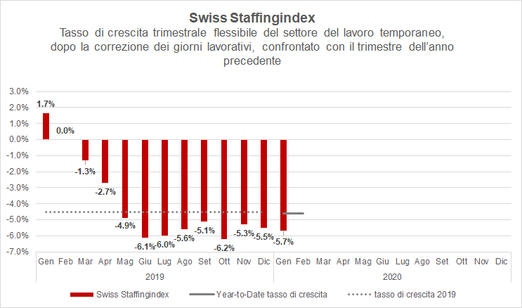 Le ore prestate sono calate del 5,7% negli ultimi tre mesi rispetto allo stesso periodo l'anno scorso. Il solo mese di gennaio presenta una contrazione del 4,6%. Il mercato del lavoro temporaneo continua pertanto a non dare segni di ripresa.