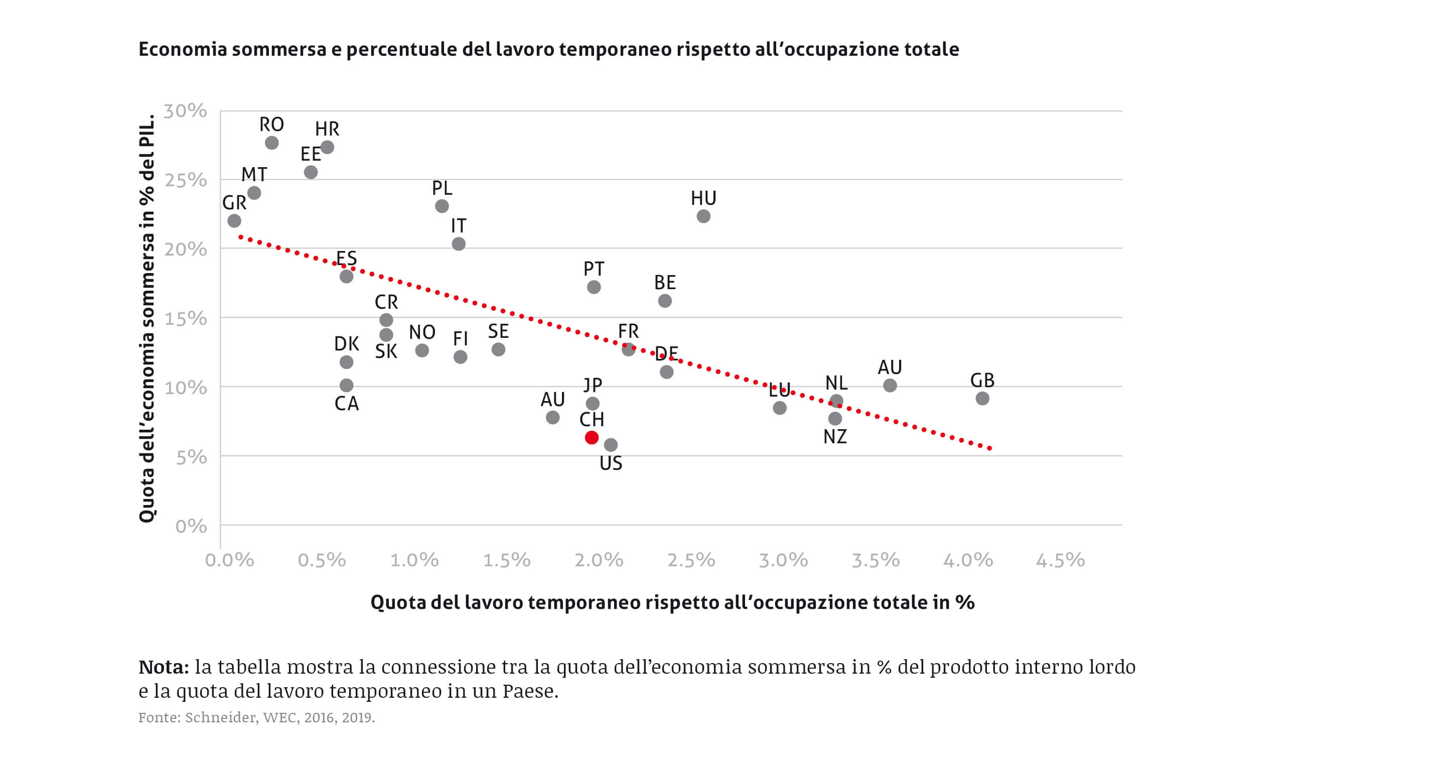 La salvaguardia di mercati del lavoro liberali è essenziale per i lavoratori, per chi cerca un impiego, per l'economia e per lo Stato. Per le prime due categorie, la flessibilità garantisce l'integrazione nel mercato del lavoro. Le cifre di swissstaffing dimostrano che sono in particolare gli attori «deboli», come gli ausiliari e i lavoratori con più di cinquant'anni, a beneficiare della flessibilità del lavoro temporaneo, soprattutto se vengono collocati da un'azienda di servizi per il personale subito dopo aver perso un impiego. Per l'economia, la flessibilità è un vantaggio fondamentale per mantenere la competitività sul piano internazionale. L'esempio del lavoro temporaneo è illuminante: maggiore è la quota di lavoro temporaneo rispetto all'occupazione complessiva di un paese, più questo ottiene un punteggio alto nell'indice di competitività globale del Forum economico mondiale. Lo Stato, infine, beneficia di un maggiore tasso di integrazione nel mercato del lavoro, con conseguenti incremento del gettito fiscale e dei contributi alle assicurazioni sociali, e riduzione dell'economia sommersa.