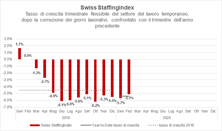 L'ultimo Swiss Staffingindex, precedente all'emergenza coronavirus, era già a tinte profondamente rosse. Tra dicembre e febbraio, il numero di ore prestate è calato del 5,1% rispetto allo stesso periodo dell'anno precedente. Nei mesi di gennaio e febbraio, lo sviluppo year to date ha fatto invece segnare una contrazione del 5,4%. L'emergenza coronavirus è dunque esplosa in un contesto di mercato già fragile.
