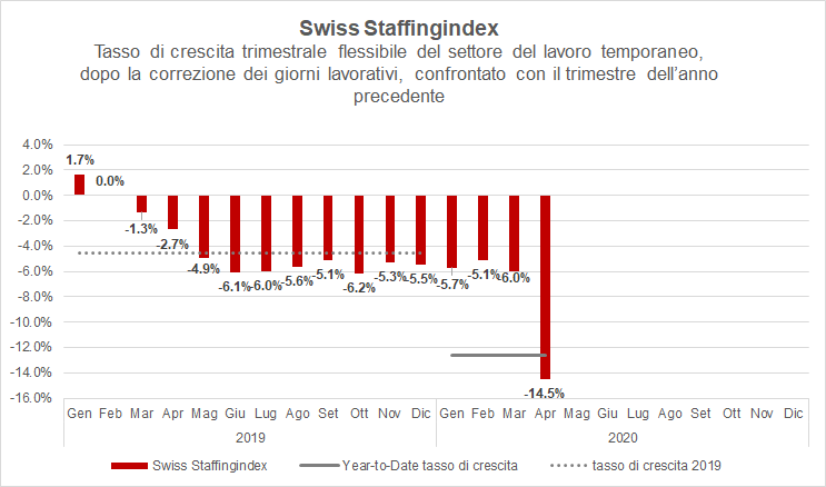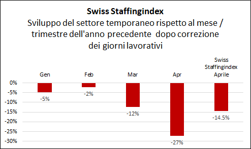 Secondo lo Swiss Staffingindex, nei mesi di febbraio, marzo e aprile 2020 l'attività del settore del lavoro temporaneo è calata del 14,5% rispetto allo stesso periodo dell'anno precedente. In aprile, il primo mese completo di emergenza coronavirus, la contrazione delle ore prestate è stata addirittura del 27%. Le cifre non considerano le ore del lavoro ridotto.