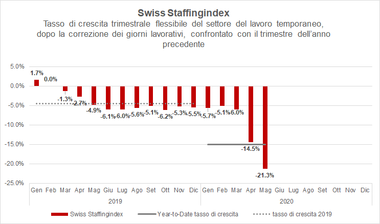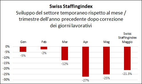 Secondo lo Swiss Staffingindex, nei mesi di marzo, aprile e maggio 2020 l'attività del settore del lavoro temporaneo è calata del 21,3% rispetto allo stesso periodo dell'anno precedente. In aprile e in maggio, i mesi in cui ha imperversato l'emergenza coronavirus, la contrazione è del 27%, rispettivamente del 24%. Le misure di allentamento post pandemia adottate in maggio non hanno quindi ancora generato l'auspicata ripresa.