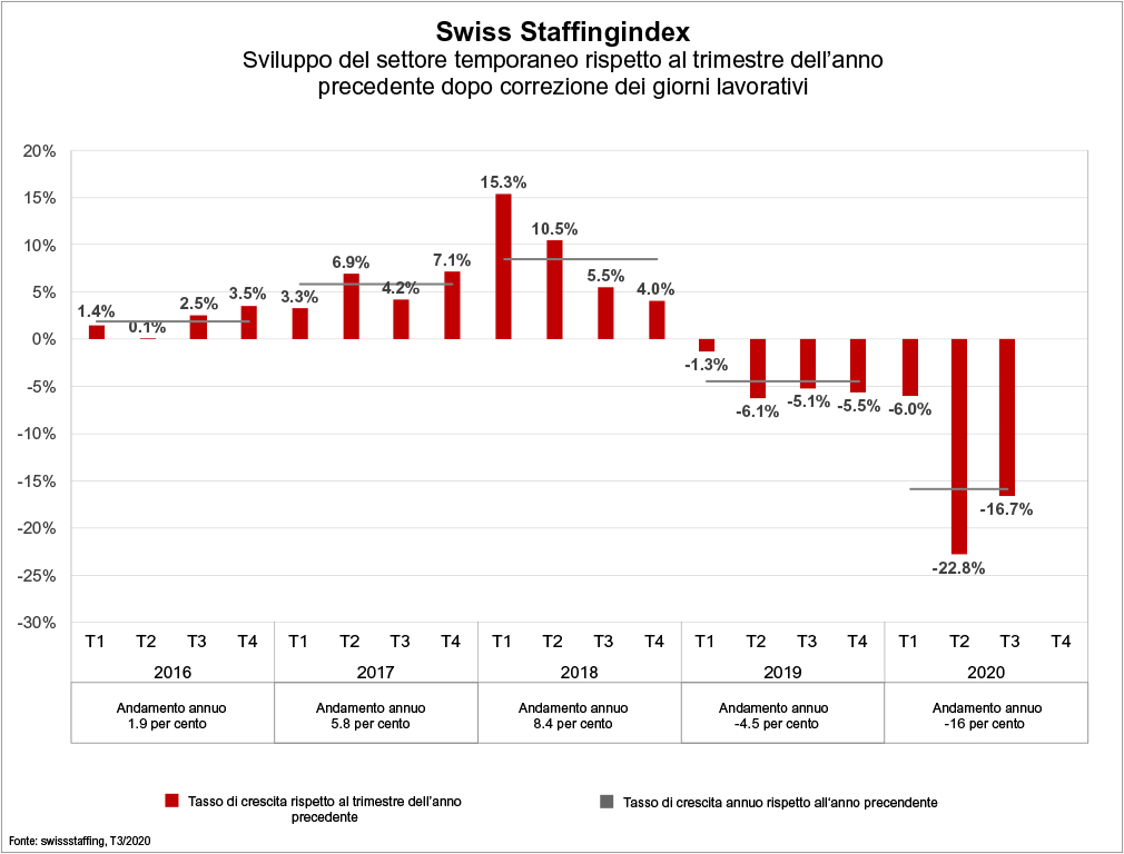Il settore del lavoro temporaneo è lo strumento di misurazione del mercato del lavoro svizzero. Nel terzo trimestre 2020 lo Swiss Staffingindex ha subito una flessione del 16,7 % rispetto all'anno precedente. Il principale indice del settore ha così recuperato solo leggermente rispetto al secondo trimestre. Nonostante gli allentamenti delle misure, la crisi del coronavirus ha fatto registrare cifre in rosso tra i prestatori di personale. Per chi è senza lavoro, la ricerca diventa sempre più difficile. L'acuta ondata di contagi e la minaccia di contromisure fanno prevedere un crollo ancora più marcato delle attività nel quarto trimestre che durante il lockdown.